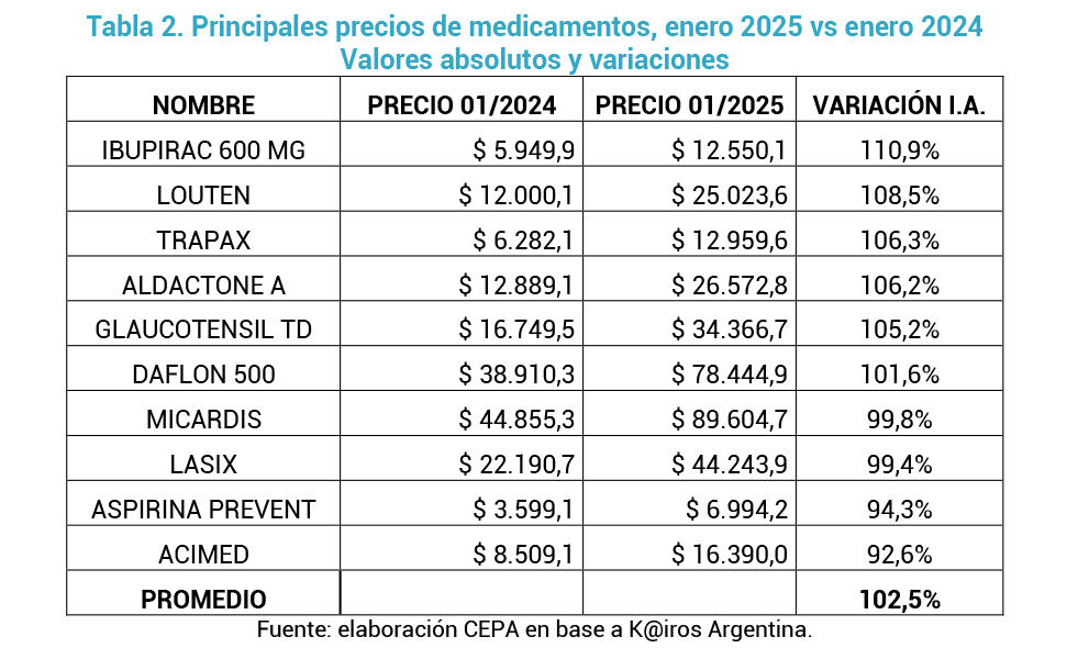 Asimismo, por encima del 84,7% de inflación interanual a enero de 2025, el promedio de los 10 medicamentos que más aumentaron en el último año alcanza una suba interanual de 102,5%. Por encima del promedio encontramos subas interanuales de hasta 110,9% para IBUPIRAC 600 MG y 108,5% para LOUTEN.