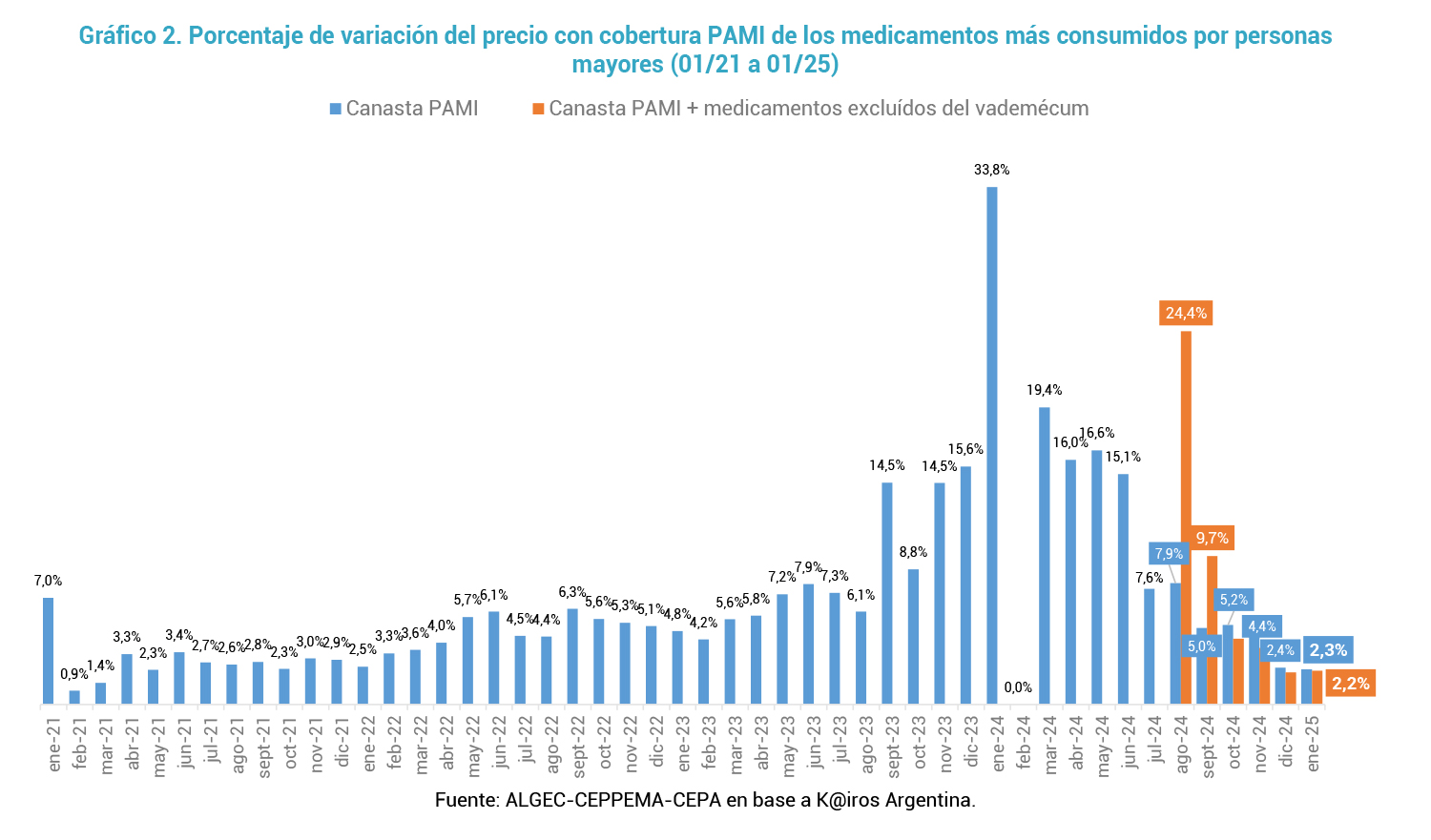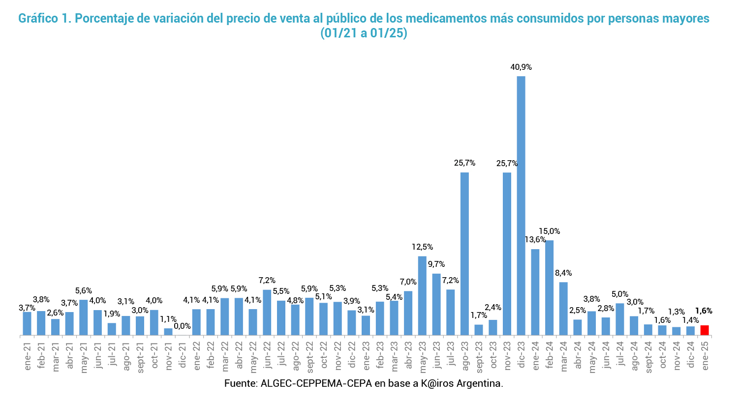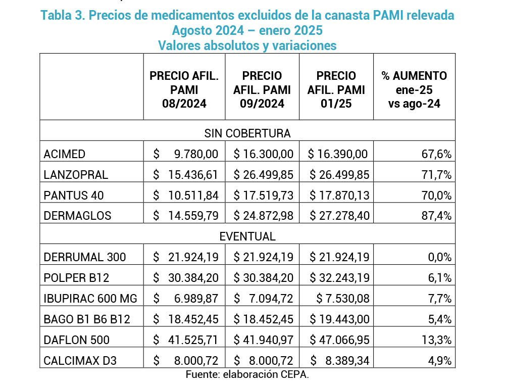 De esta manera, los precios de los medicamentos con cobertura PAMI desde noviembre de 2023 hasta enero de 2025, registraron una inflación acumulada de 361,6%, muy por encima del aumento promedio de 220,0% de los precios de venta al público.