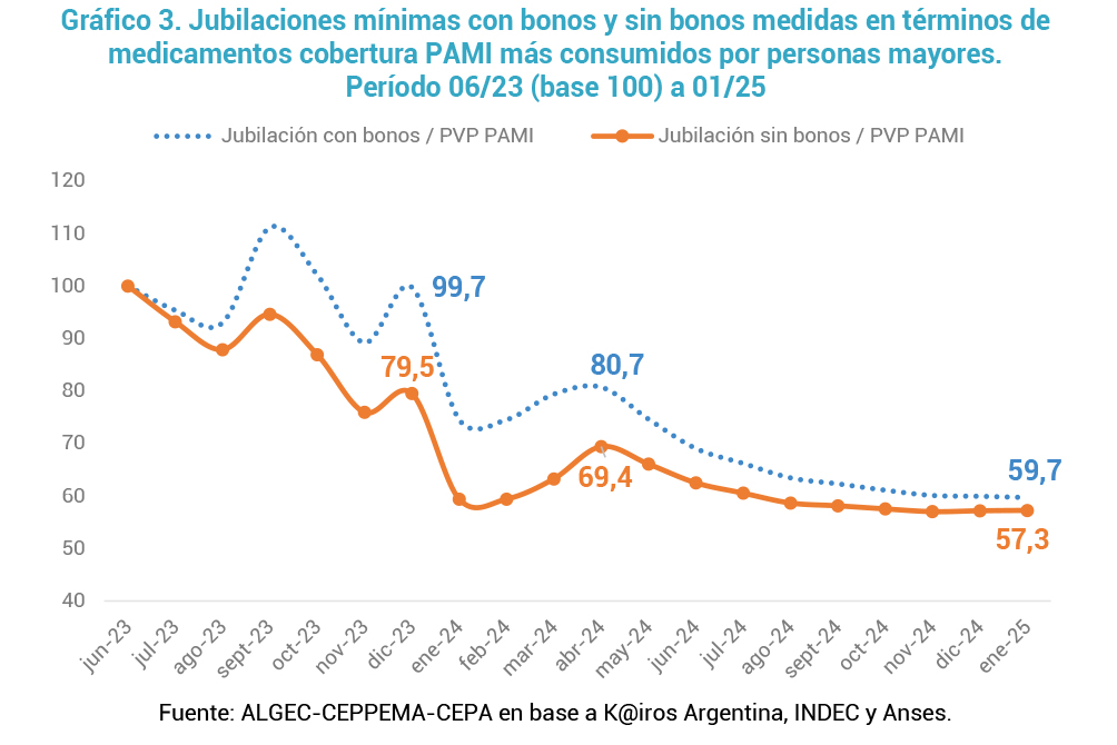 - La jubilación mínima con bonos, en términos de la canasta de medicamentos PAMI, sufre una caída de 40,3 puntos porcentuales entre junio 2023 y enero 2025. Por su parte, la caída de la jubilación mínima sin bonos en el mismo período es de 42,7 puntos porcentuales.