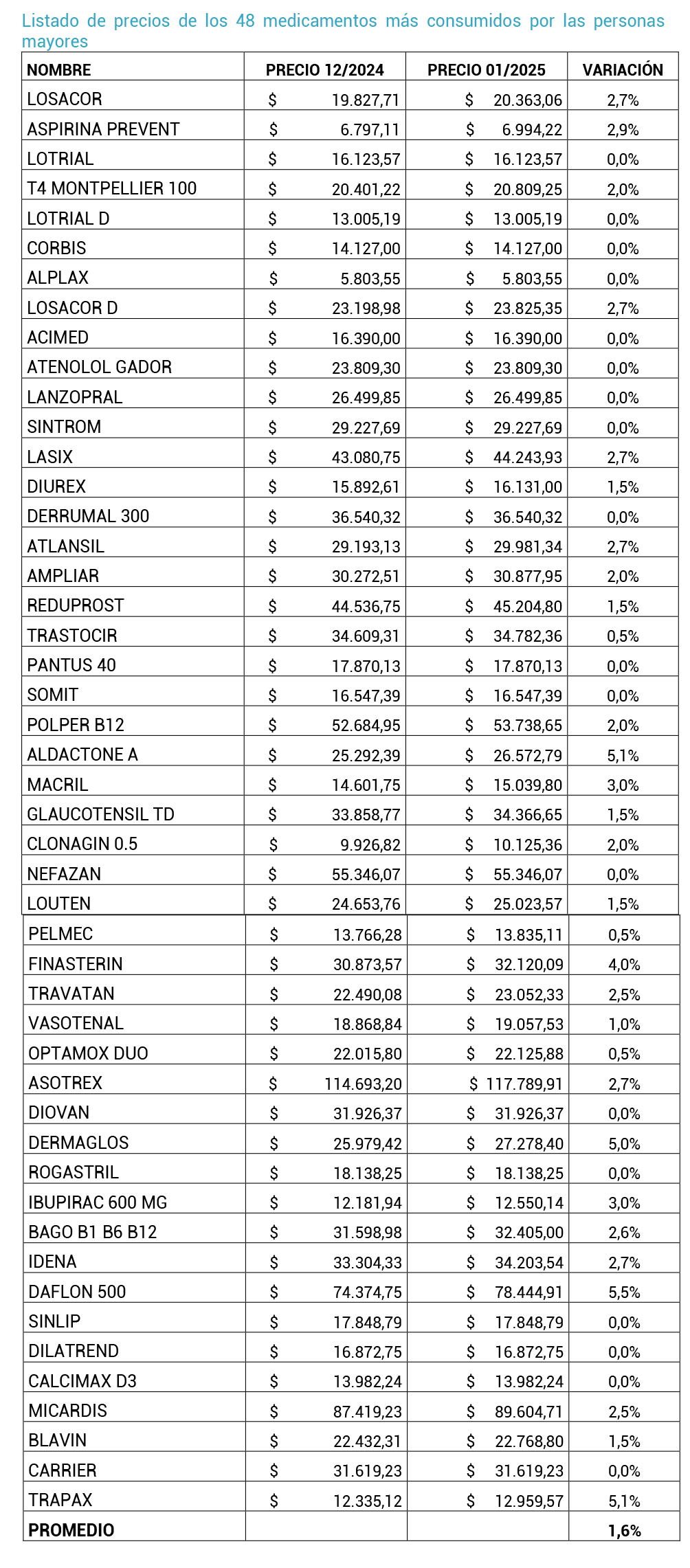 - Dentro del aumento de 1,6% en enero que sufrió la canasta de medicamentos más consumidos por las personas mayores, se destacan la suba de 3,9% en promedio de los 10 medicamentos que más aumentaron. Por encima del promedio, encontramos subas mensuales de 5,5%.