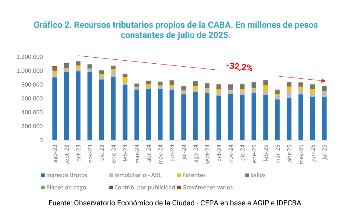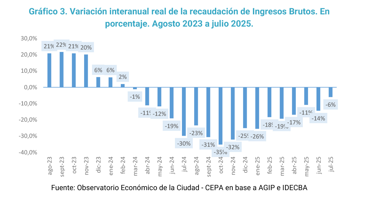 Analizando la dinámica de la recaudación propia de los últimos 24 meses, especialmente del Impuestos sobre los Ingresos Brutos, que como ya se advirtió es por lejos el principal ingreso de la Ciudad, se percibe un incremento real sostenido desde marzo 2023 hasta octubre de ese mismo año. A partir de octubre de 2023, Ingresos Brutos entra en un notable sendero de caída real de la recaudación. Entre octubre de 2023 y julio 2025 dicha caída es del 32,2% en términos reales.