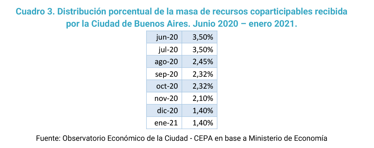 - Vinculado a este tema, el informe aborda el debate entre Ciudad y Nación respecto al coeficiente de Coparticipación y el acuerdo alcanzado: 1,4% de coparticipación por goteo diario, es decir la forma habitual; y el 1,55% adicional por transferencia semanal.