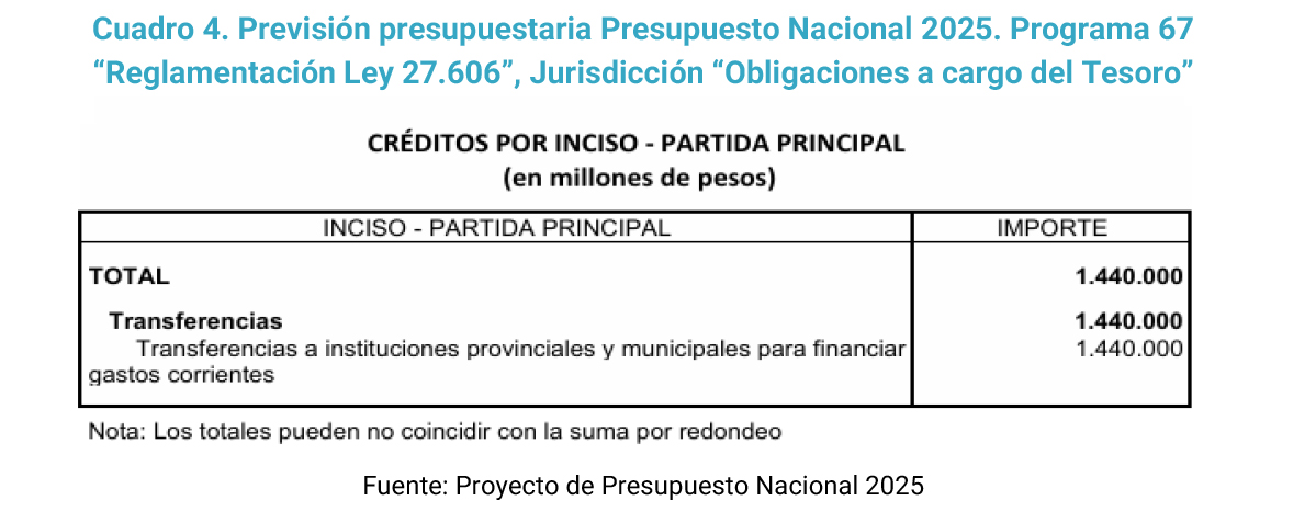 Los giros de dichos fondos no se realizarán junto al resto de los fondos coparticipables, sino que serán transferencias del Tesoro Nacional en el marco del Programa 67 “Reglamentación Ley 27.606” y “Cumplimiento de Medida Cautelar CSJN 1864/2022”, que revista en la Jurisdicción “Obligaciones a Cargo del Tesoro”.