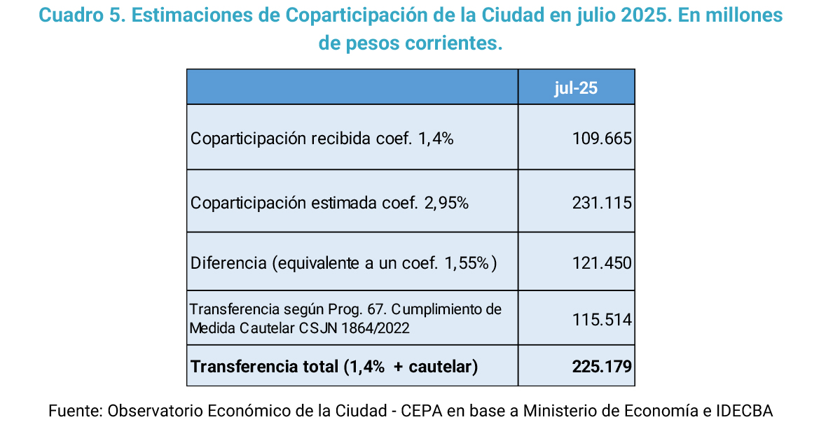 El CEPA realizó una estimación para conocer los montos de dinero en disputa. Durante el mes de julio de 2025 la Ciudad recibió más de 109 mil millones de pesos de coparticipación y financiamiento educativo, equivalente al 1,4% de la masa de fondos coparticipables. El monto equivalente al coeficiente de 1,55% de coparticipación, es decir el adicional que resulta de la medida cautelar de la Corte Suprema, debería ser de 121 mil millones de pesos. En esta ocasión, la Nación transfirió a la Ciudad en concepto de la cautelar de la Corte el monto de 115 mil millones de pesos, o sea casi 6 mil millones de pesos menos de lo estimado. De esta forma, el monto efectivamente recibido durante este periodo fue de 225 mil millones de pesos, cuando según el coeficiente de 2,95% debiera haber sido de 231 mil millones de pesos.
