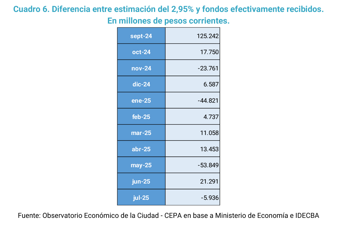 En principio, pareciera haber un proceso de consolidación en curso dado que mes a mes se observan diferencias entre lo que le corresponde a la Ciudad según el coeficiente de 2,95% establecido por la cautelar de la Corte Suprema, y lo efectivamente transferido tanto por goteo diario como por transferencia del Tesoro. Este monto durante el mes de julio llegó a los 5,9 mil millones de pesos.