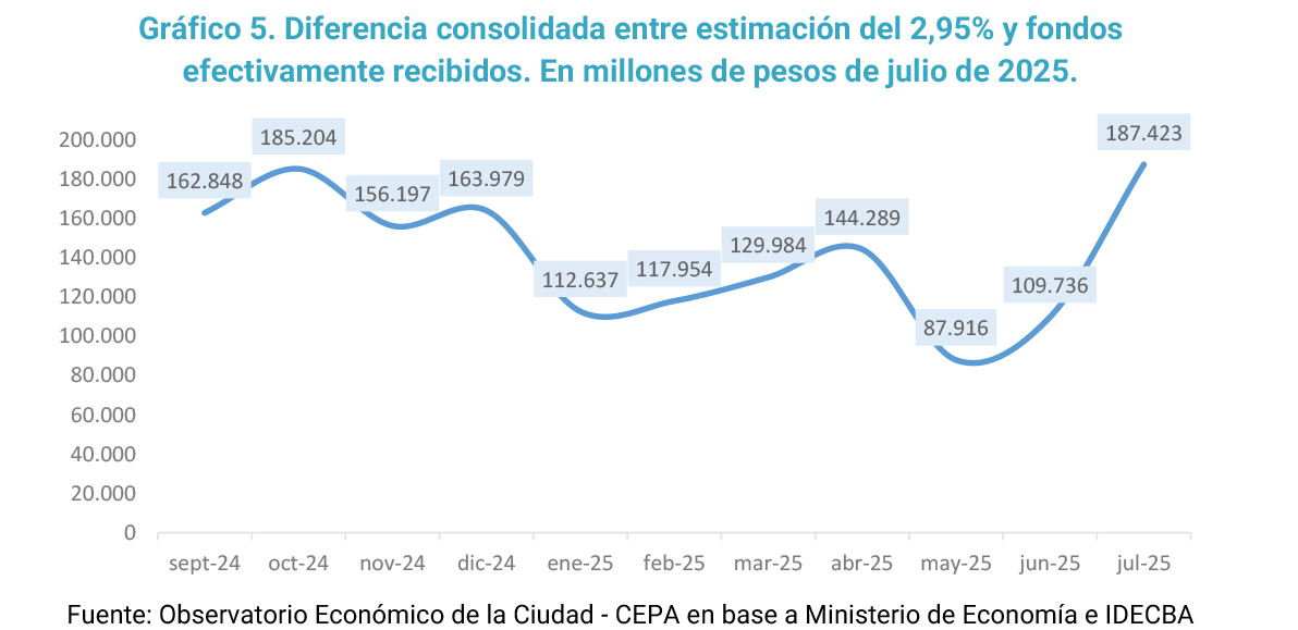 Sin embargo, al actualizar esos saldos a precios de julio de 2025, se observa una tendencia levemente descendente, con un incremento significativo en los dos últimos meses. Al último mes analizado la diferencia consolidada entre la masa de recursos equivalente a un coeficiente de 2,95% y los fondos efectivamente recibidos por la Ciudad es de 187 mil millones de pesos a precios de julio 2025.