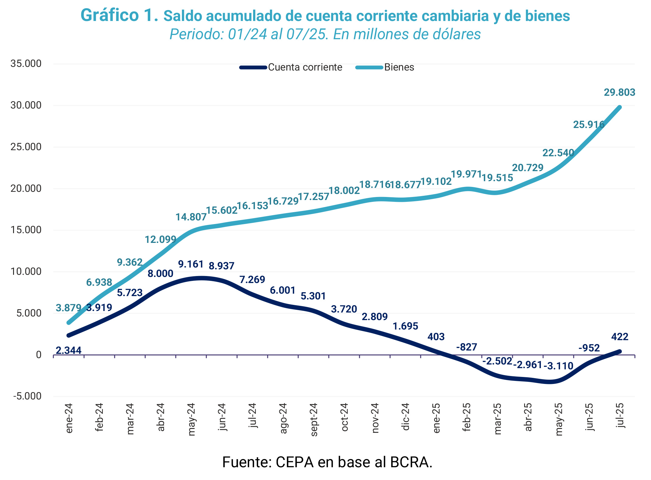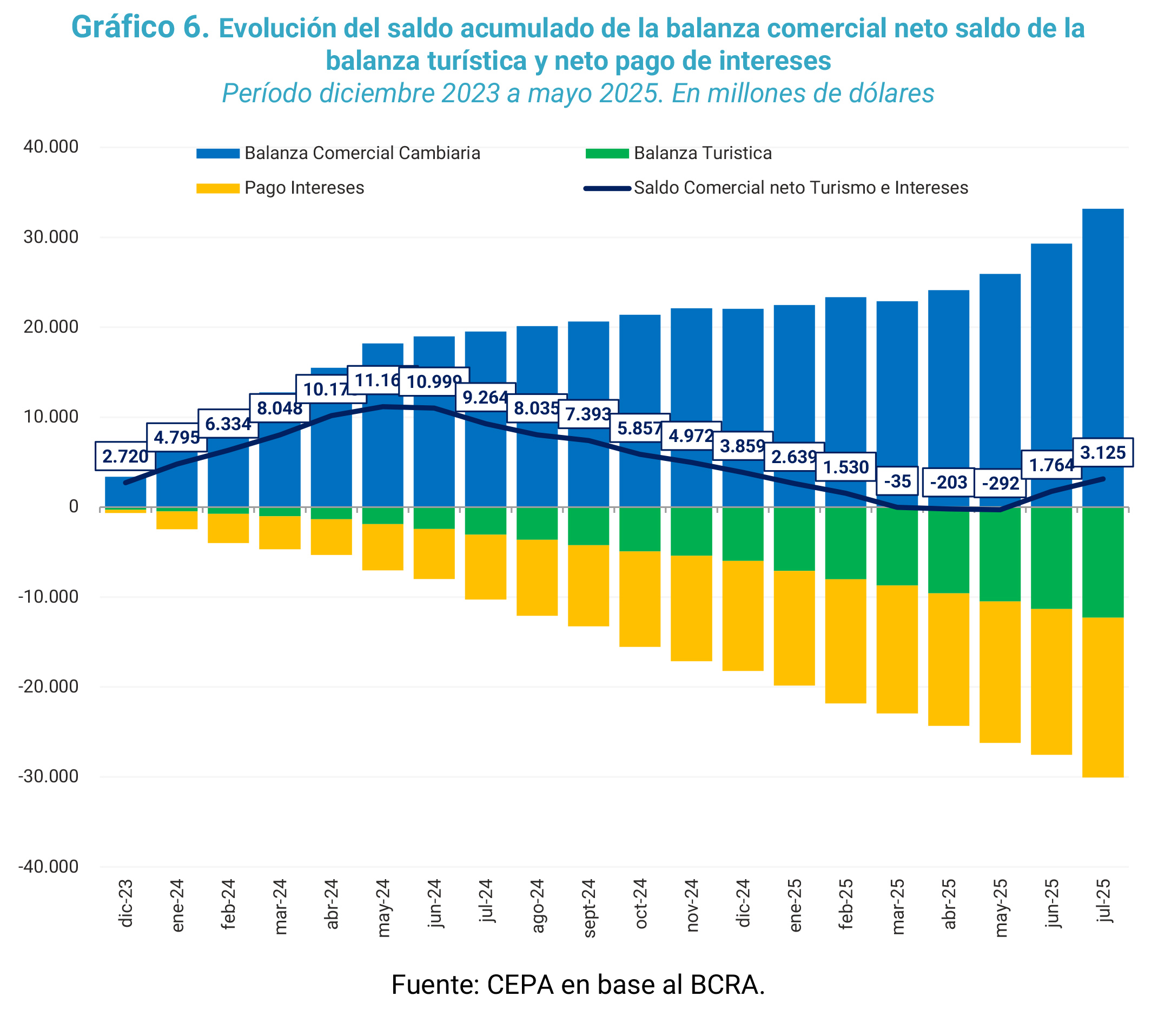 La Balanza Comercial de Bienes acumula USD 33.184 millones entre diciembre de 2023 a junio de 2025. Sin embargo, ese saldo se convierte a sólo USD +3.125 millones al restar la Balanza Turística (USD -12.302 millones) y el pago de intereses (USD -17.757 millones). En otras palabras, intereses y turismo prácticamente se consumen el saldo comercial de bienes desde diciembre de 2023. El esfuerzo productivo del complejo exportador es absorbido por los compromisos derivados del nivel de endeudamiento y del tipo de cambio que promueve el turismo emisivo, entre otras cosas.