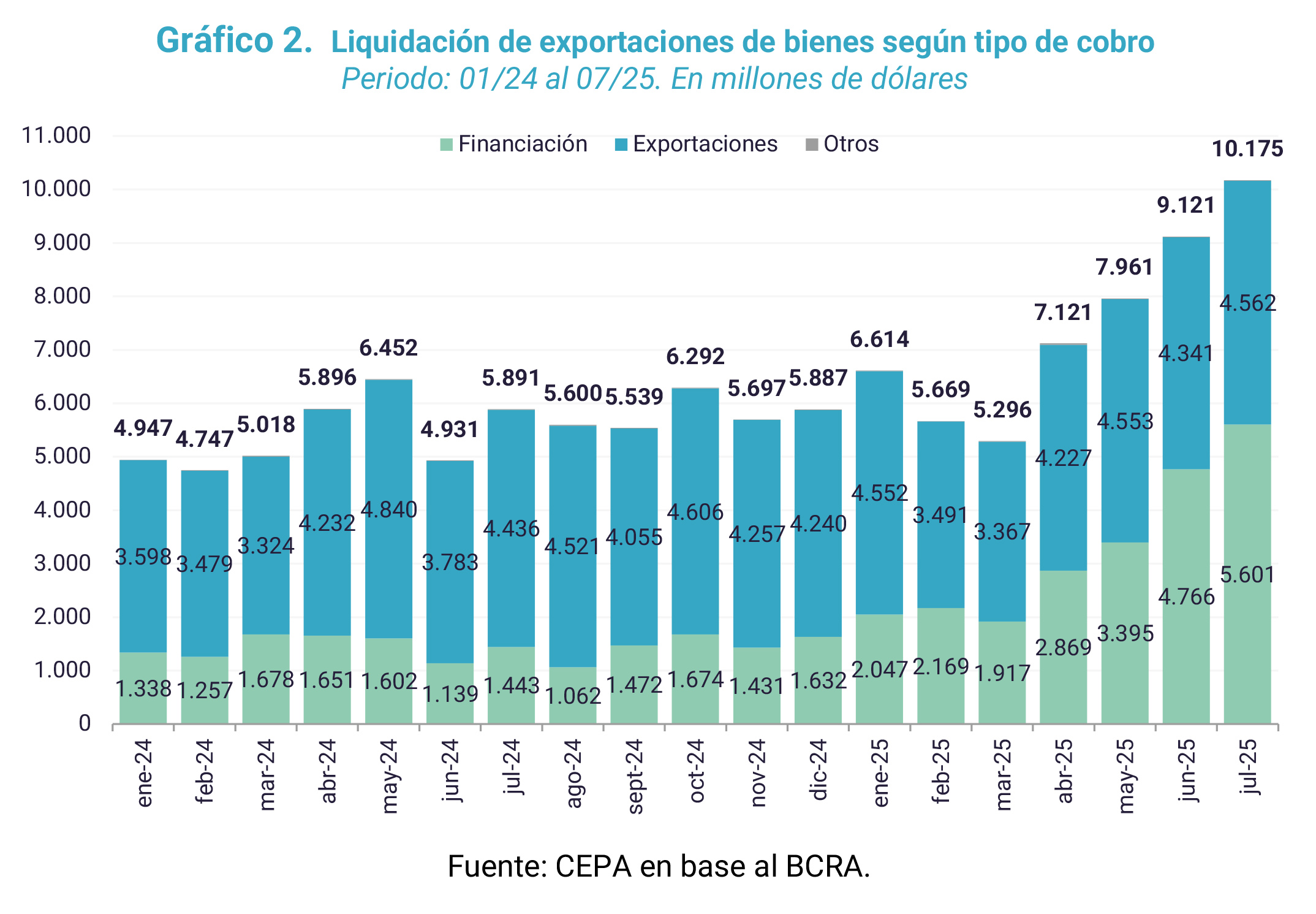 Durante el año 2024 la financiación (sumatoria del cobro anticipado, financiaciones locales y prefinanciaciones de exportaciones) de la liquidación del pago de exportaciones promedió el 26% del total liquidado. Sin embargo, en 2025 la financiación paso a representar una porción más importante de la liquidación total, al ser impulsado por la liquidación anticipada. En los primeros siete meses promedió el 42% de la liquidación total, alcanzando USD 22.765 millones, mientras que el cobro de exportaciones fue de USD 29.093 millones.