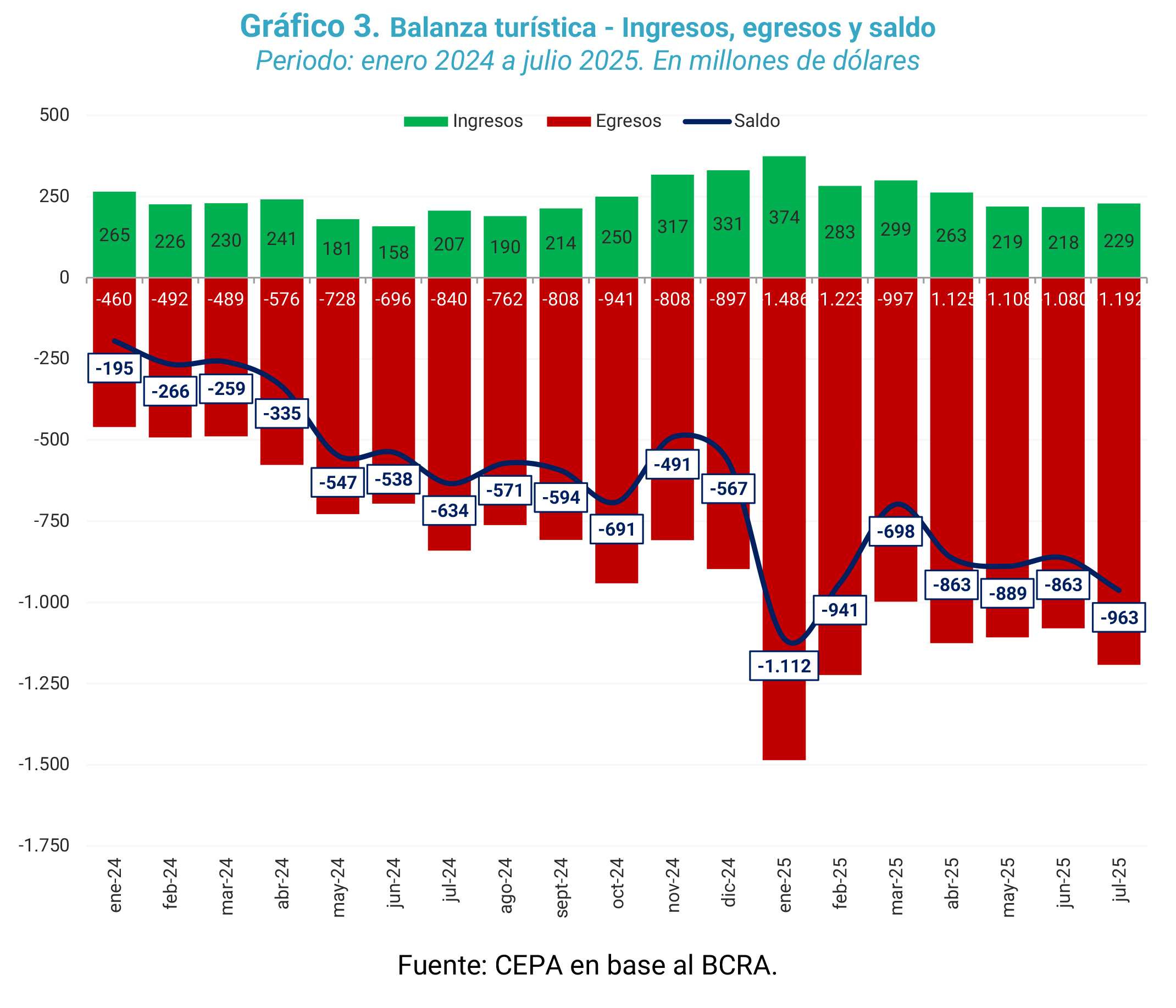 En julio, la balanza turística se sostuvo negativa por USD 962,9 millones, superando en tan solo siete meses el saldo acumulado de la totalidad de 2024 (USD 6.327 millones en 2025 vs USD 5.688 millones en 2024).
