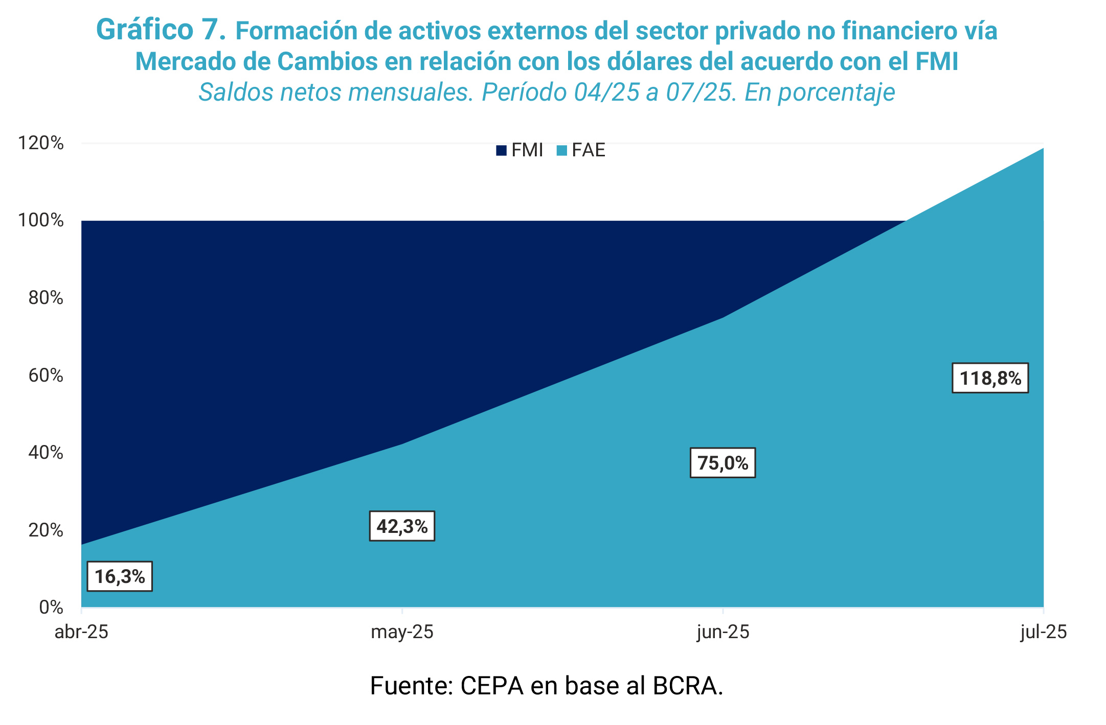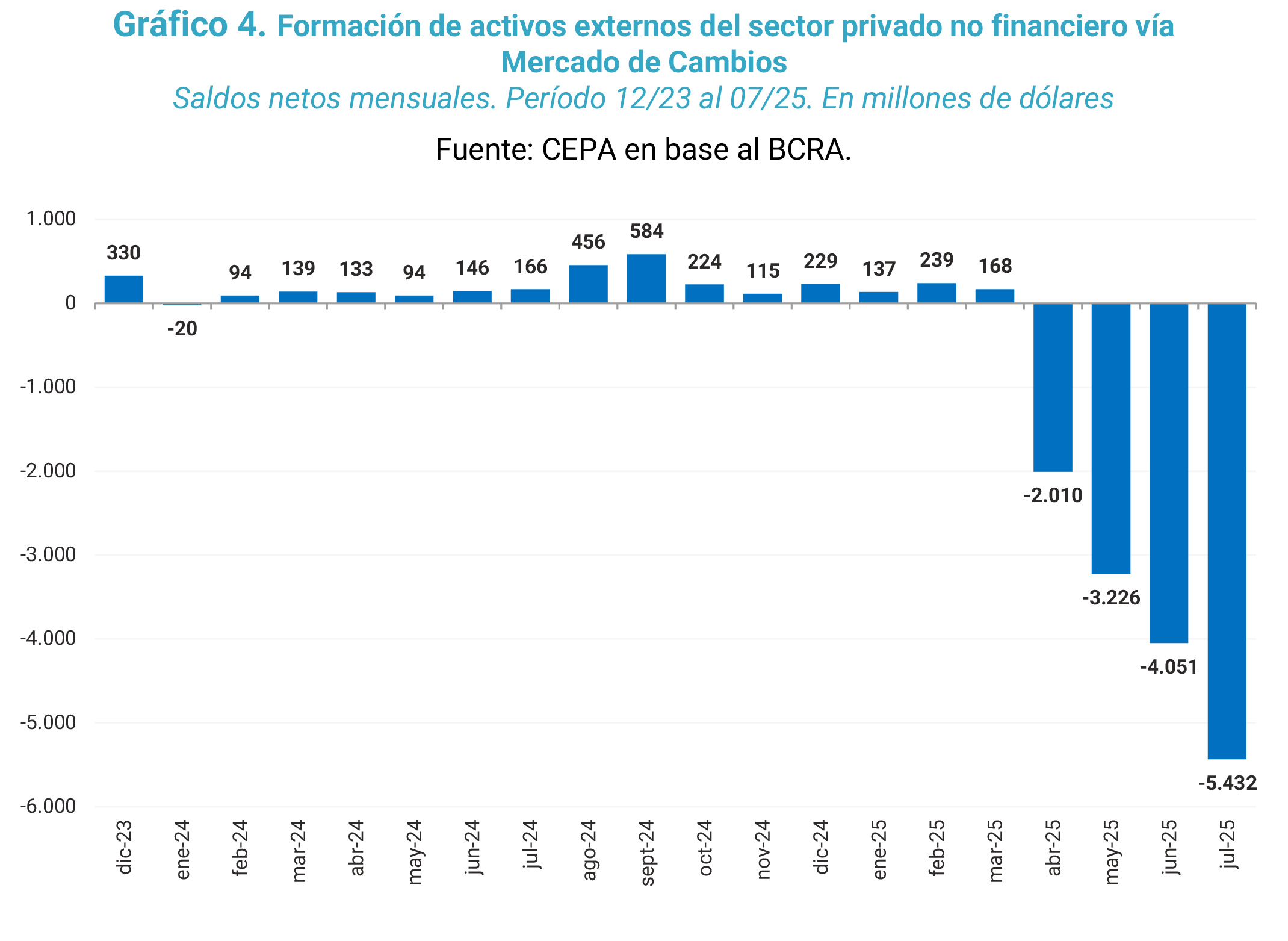 La Formación de Activos Externos sumó USD 2.010 millones en abril, USD 3.226 millones en mayo, USD 4.051 millones en junio, y USD 5.432 millones en julio, totalizando USD 14.730 millones.