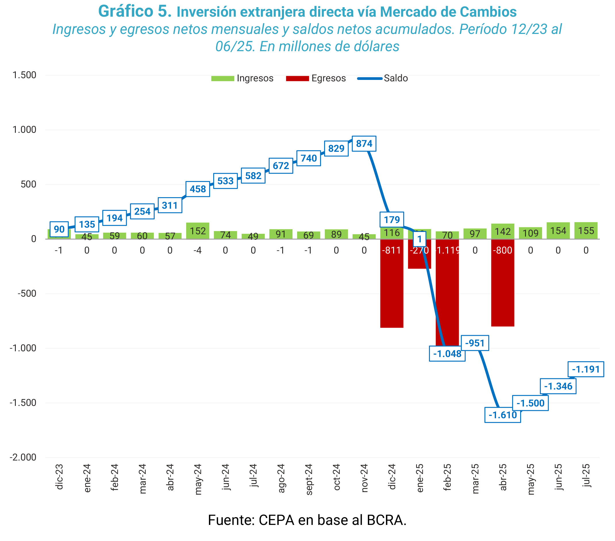 En julio 2025 la Inversión Extranjera Directa volvió a ser positiva en apenas USD 155 millones. Sin embargo, el saldo acumulado resulta negativo por USD 1.191 millones si se toma en cuenta el período desde diciembre 2023. Nunca en la historia del MULC la IED había dado negativa. Esto da cuenta de la deficiencia en su desempeño del Régimen de Incentivo a las Grandes Inversiones (RIGI), aprobado en el marco de la Ley Bases en julio 2024.