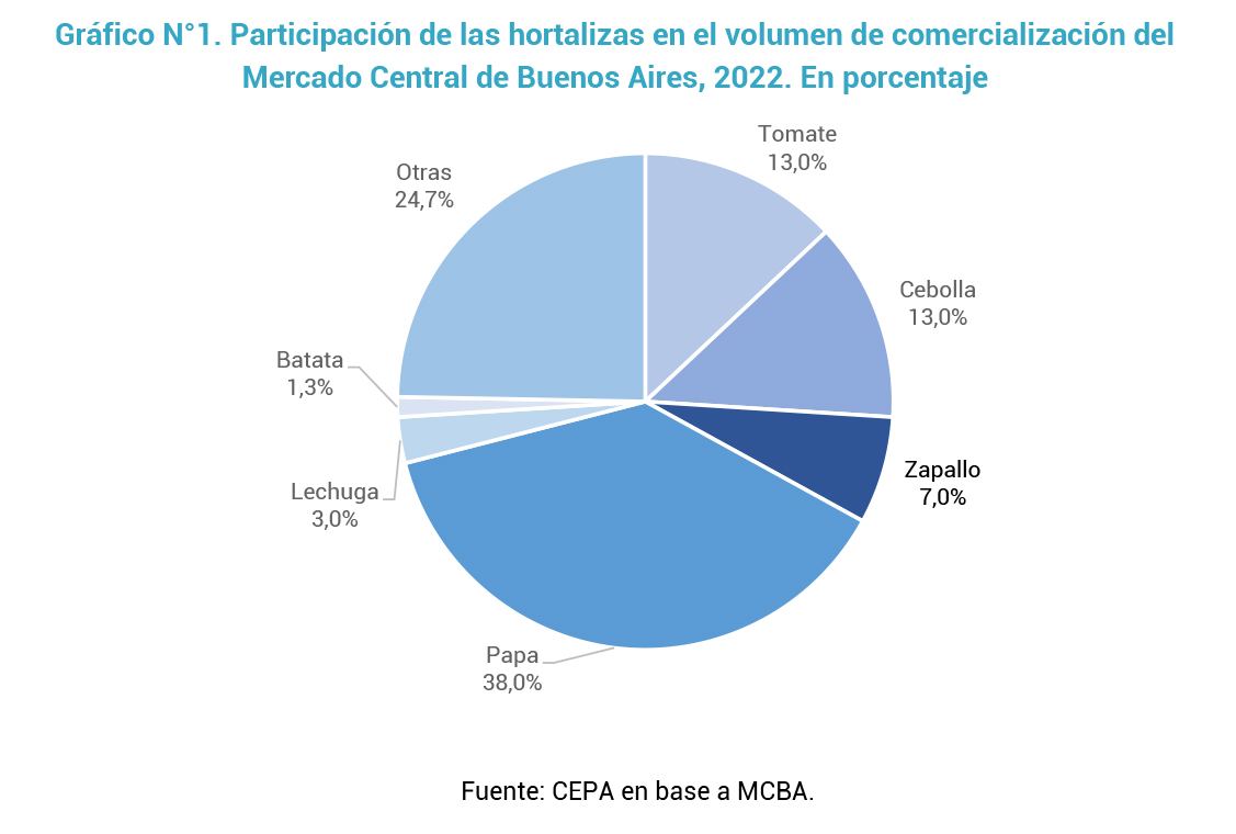 A los fines del abordaje metodológico, en este informe se considera una muestra de las especies incluidas en VTL que, en conjunto, representan 75,3% del volumen de comercialización del Mercado Central de Buenos Aires (MCBA): papa 38,0%, tomate 13,0%, zapallo 7.0%, cebolla 13,0%, lechuga 3,0% y batata 1,3%.