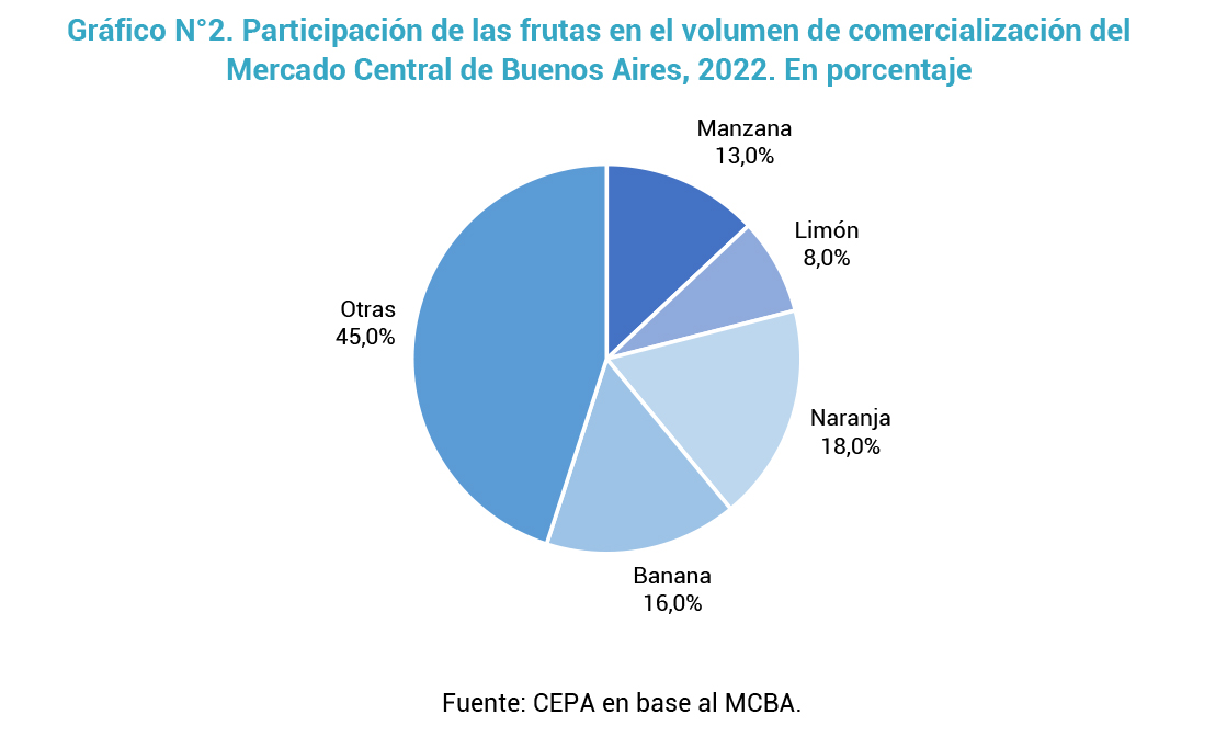 Las especies que conforman el segmento frutas son: banana, limón, manzana y naranja las cuales representan 55,0% del volumen comercializado: naranja 18,0%, banana 16,0%, manzana 13,0% y limón 8,0%.