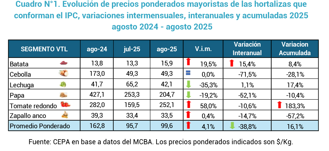 En el mes de agosto 2025, las seis especies que conforman el segmento VTL del IPC muestran un aumento en el promedio de precios ponderados de 4,1% en el Mercado Central de Buenos Aires (MCBA) respecto del mes de julio 2025.