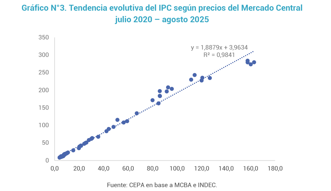 A lo largo de los años se observa que las oscilaciones de los precios mayoristas del MCBA mantienen un comportamiento similar a los precios minoristas relevados por el INDEC. La regresión lineal de ambas series muestra un R2 de 0,9841 es decir, una correlación estrecha entre ambos precios.