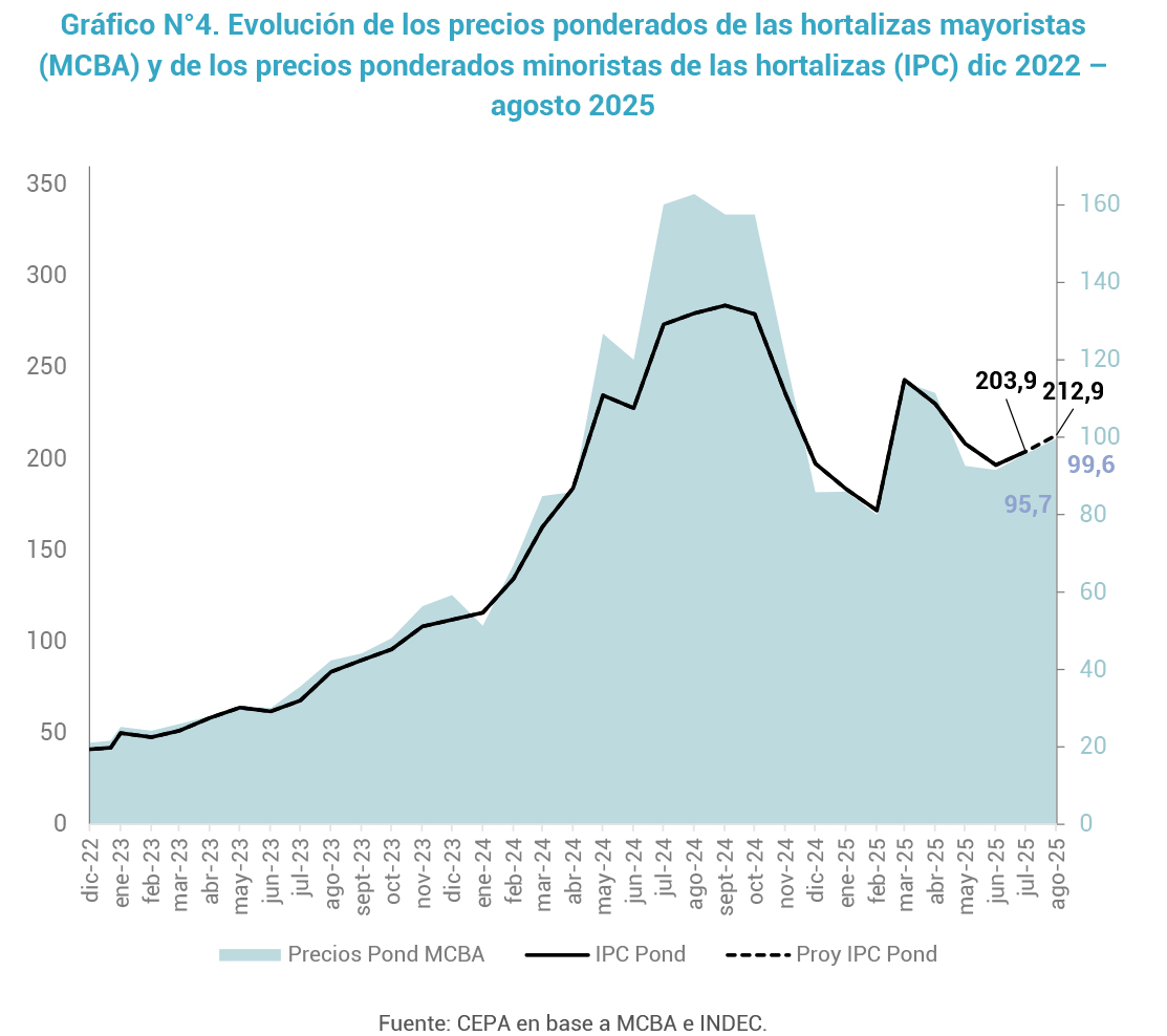 Evolución de precios de hortalizas y frutas en el Mercado Central de Buenos Aires y en grandes cadenas de supermercados: datos a agosto 2025
