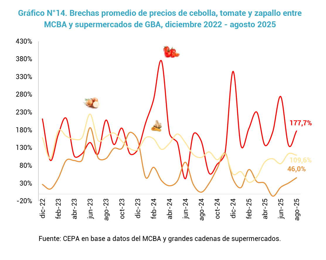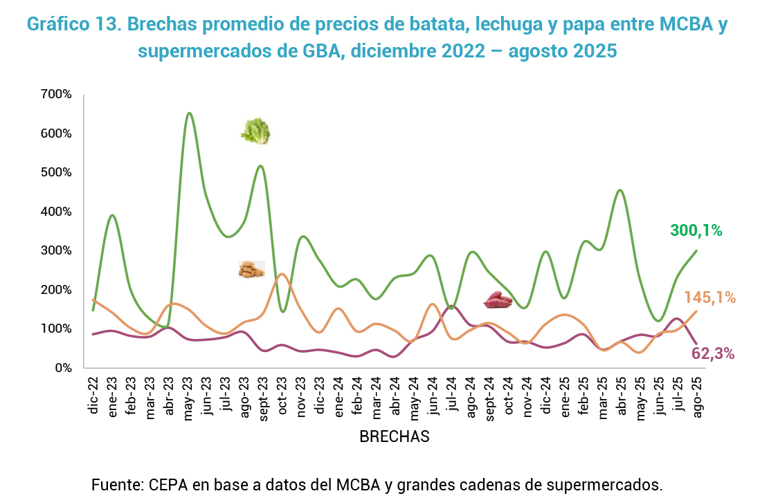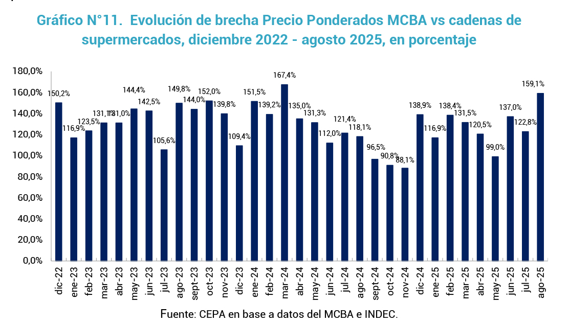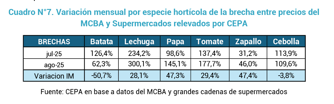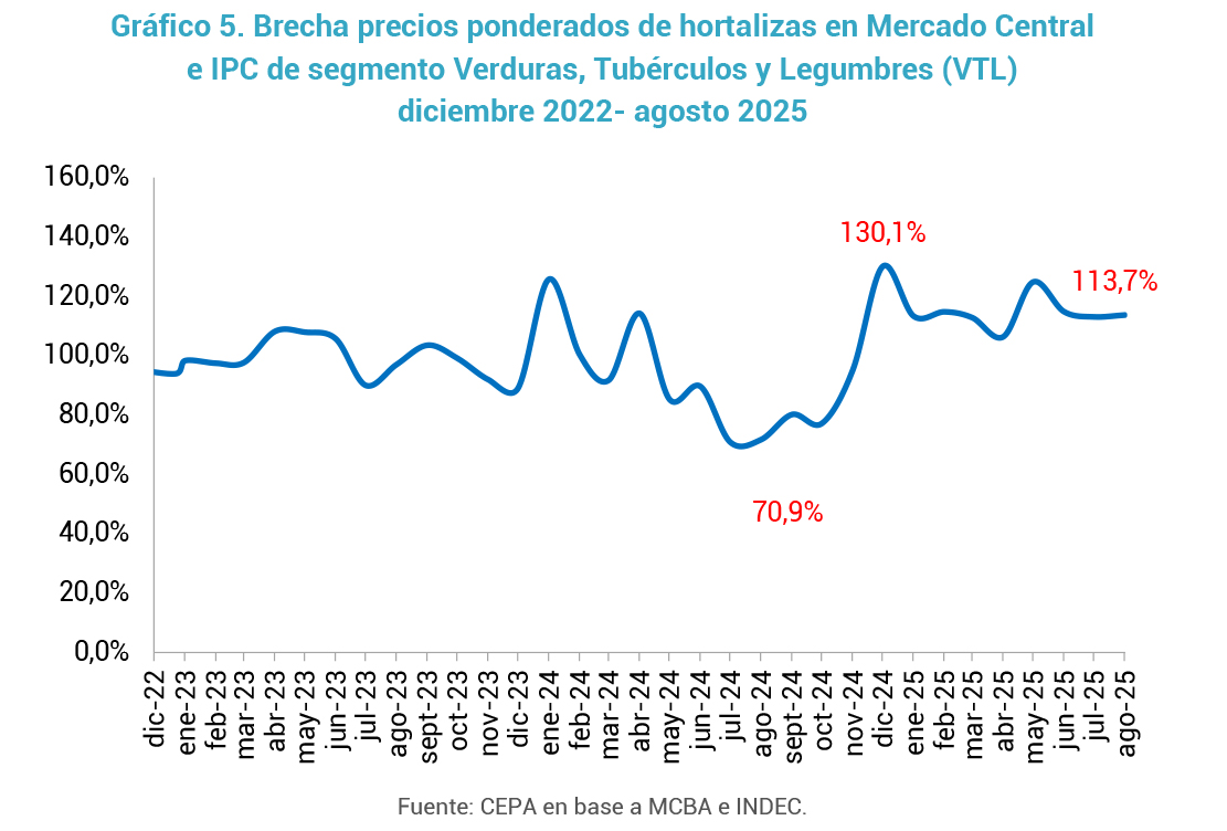 - La brecha entre los precios de hortalizas en el MCBA y los supermercados, en agosto, se ubicó en 159,1%, registrando un incremento de 36,3 p.p. en relación con el mes anterior.