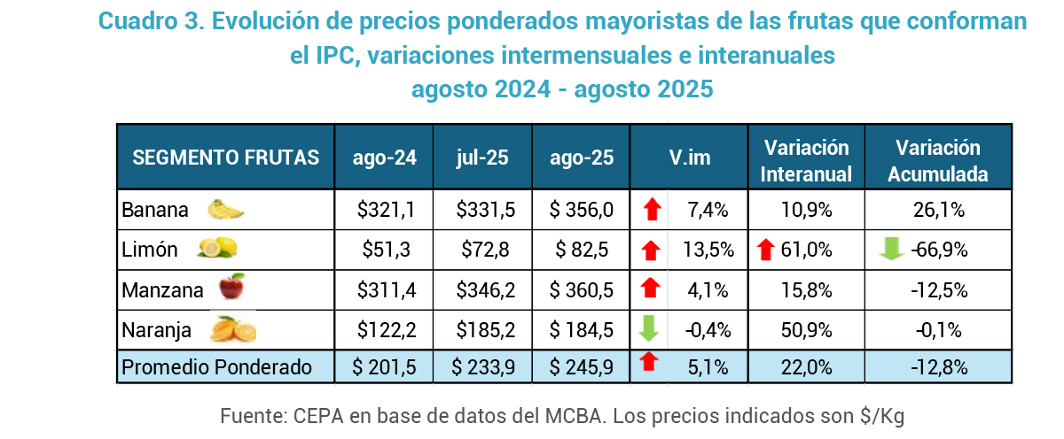 Durante el mes de agosto, la naranja fue la única fruta que contrajo sus precios ponderados un 0,4%; todas las demás mostraron un aumento en sus precios: el limón un 13,5%, la banana un 7,4%, y la manzana un 4,1%.