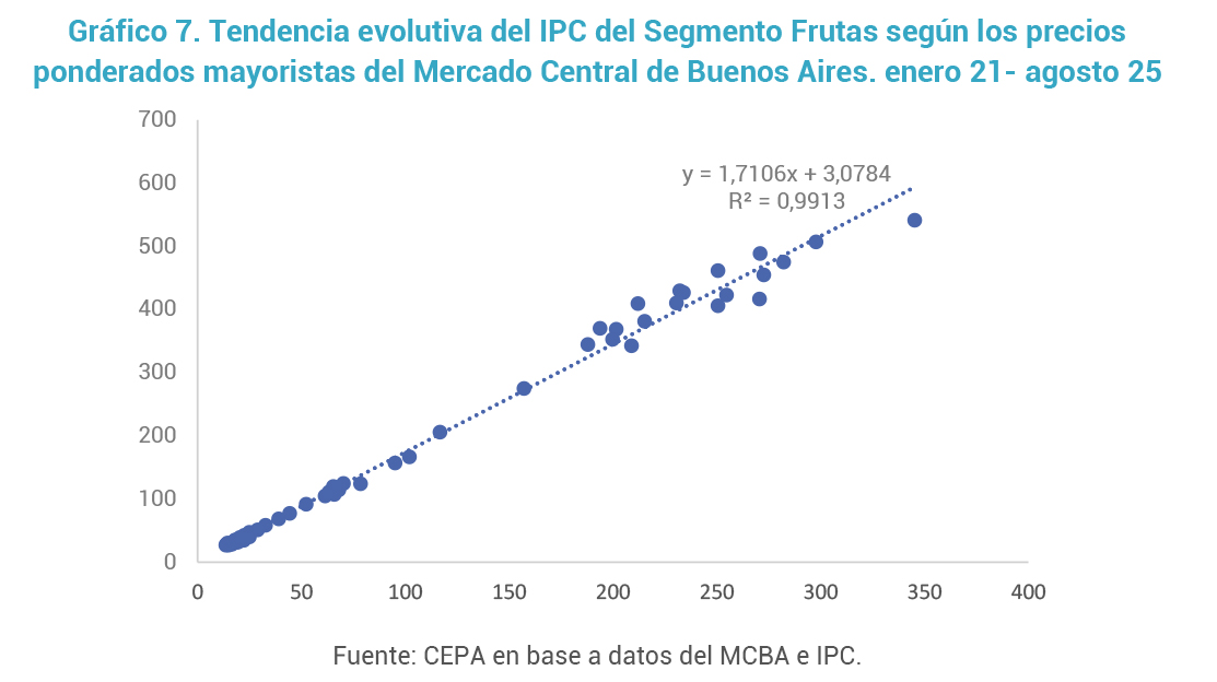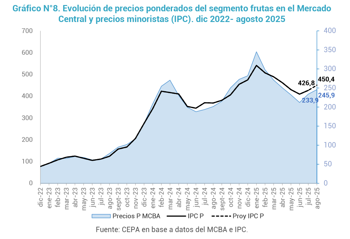 Al analizar las curvas del segmento (Gráfico N°8) podemos ver que los valores relevados en el MCBA muestran un aumento de 5,1% respecto de julio 2025, lo que permite proyectar un incremento en el precio del segmento frutas de un 5,5%. Ello impacta en 1,3% del ponderador de la división de Alimentos del IPC, lo cual provocaría una suba de 0,07% del rubro en el IPC de agosto