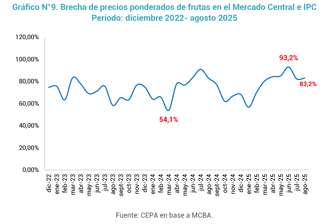 Al analizar la brecha entre el precio mayorista del MCBA y los precios minoristas relevados por el INDEC, se nota que entre diciembre de 2022 y agosto de 2025 oscila entre 70,9% y 130,1%, con una mediana de 99,1%. Además, se observa que, debido a la variación de precios, la brecha en agosto alcanzaría 113,7%, representando un aumento de 0,6 puntos porcentuales respecto al mes de julio.