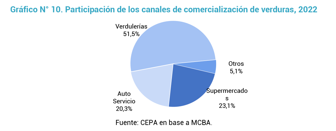 En la composición de los canales de comercialización en lo que refiere al rubro hortalizas, los supermercados ocupan 23,1% del volumen comercial, en tanto la mayoría se comercializa a través de verdulerías 51,5% y autoservicios 20,3%.