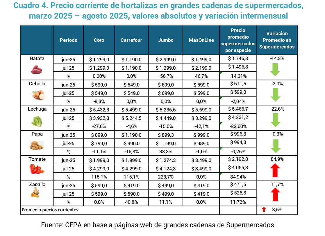 En agosto, los supermercados mostraron una contracción en el promedio de precios corrientes de las 6 especies de hortalizas de un 3,2% respecto del mes de julio. El tomate y el zapallo fueron las especies que incrementaron sus precios un 84,9% y 11,7% respectivamente. Por otro lado, las especies que contrajeron sus precios fueron la lechuga un 22,6%, la batata un 14,3%, la cebolla un 2,0% y la papa un 0,3%.