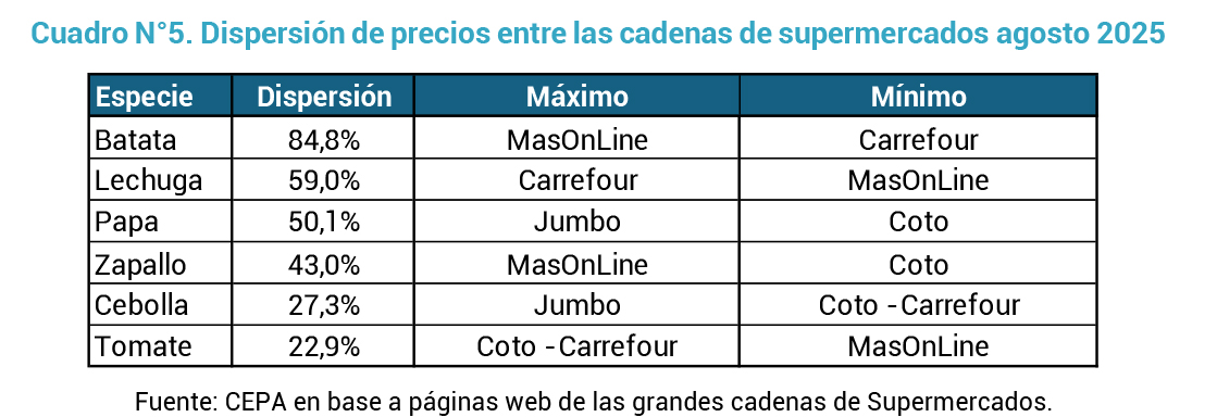 Cuando se comparan estos precios en los supermercados, podemos ver que en la mitad de las especies existe una dispersión de precios entre ellos de más de 150%. El cuadro N°5 muestra en la columna de dispersión el porcentaje de distancia de precios entre las diferentes cadenas de supermercados, destacando en las siguientes columnas qué cadenas tienen el precio mínimo y máximo.