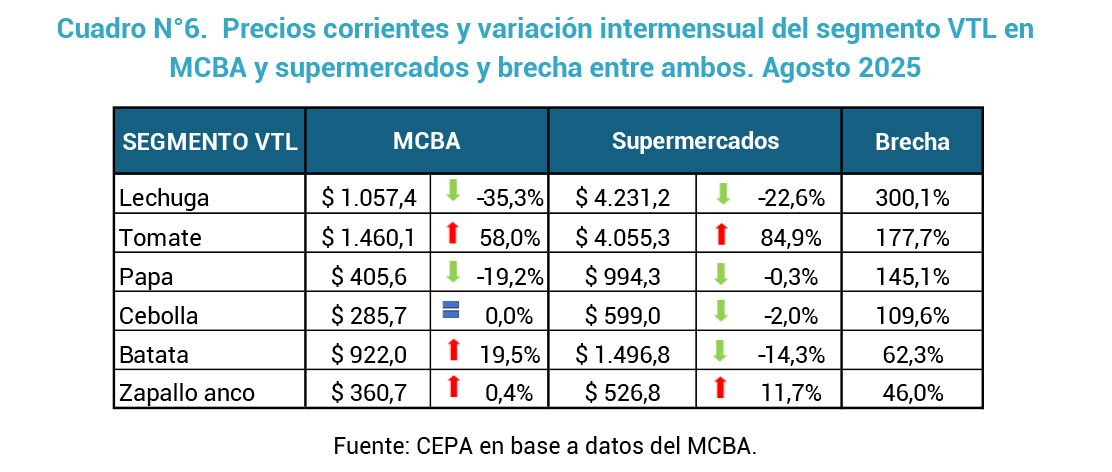 El cuadro N°6 es un análisis de los precios corrientes de las distintas especies del segmento VTL del MCBA y los Supermercados durante el mes de agosto que explican esta variación.