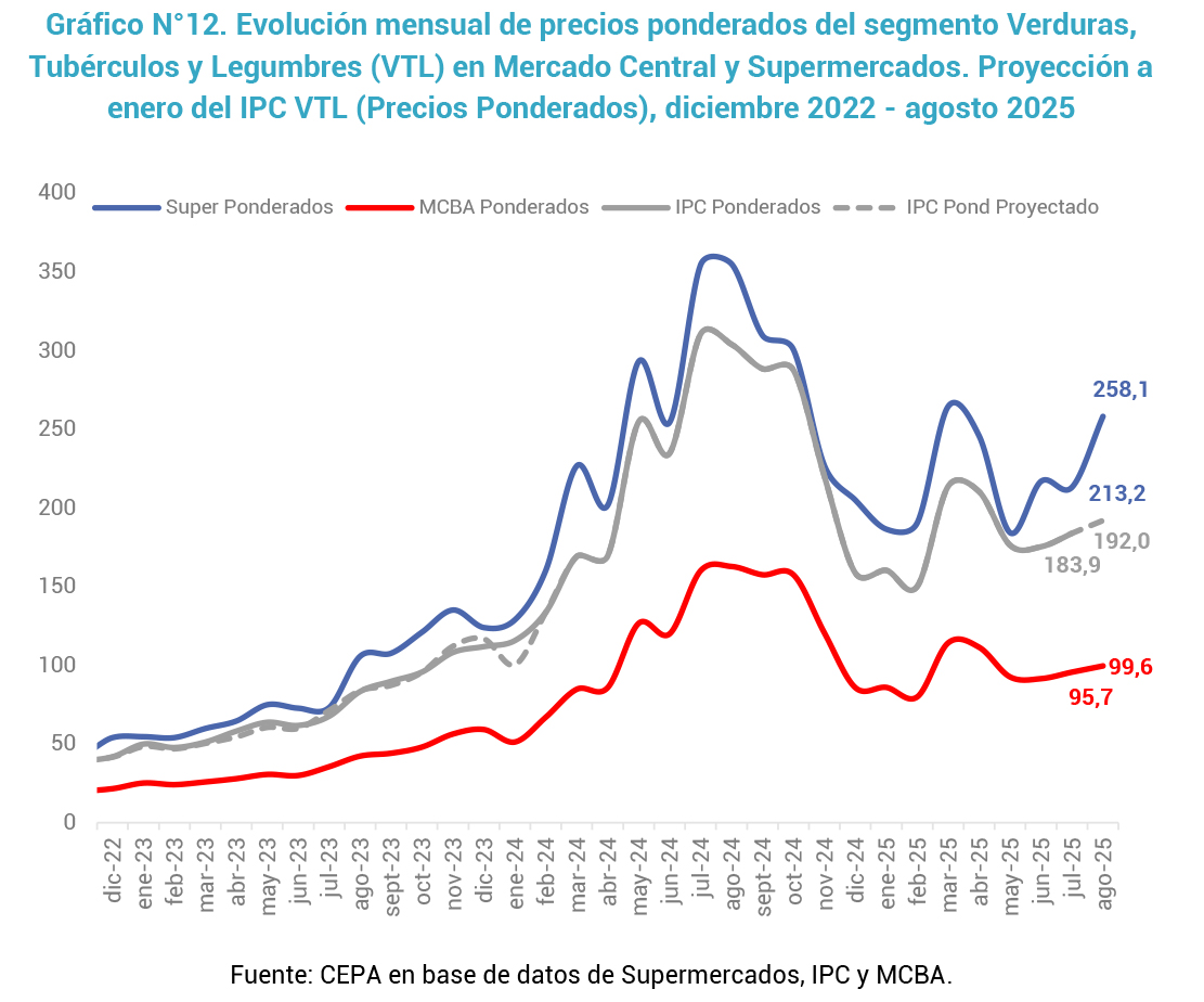 En el gráfico N°12, se puede observar la evolución entre diciembre 2022 y agosto de 2025 de los precios ponderados en el Mercado Central (MCBA), en supermercados, y la proyección del IPC VTL para el mes según CEPA.