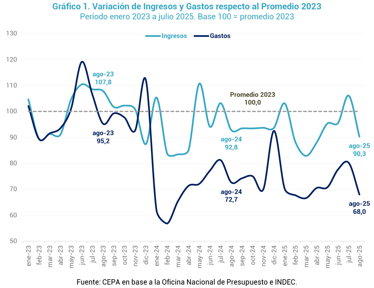 Los ingresos totales del SPN ascendieron a $11,37 billones, lo que implica una caída en términos reales de 14,9% mensual y 2,7% interanual. En cuanto al gasto público, se registraron erogaciones por $9,81 billones, lo que representa una caída de 15,2% mensual, menor fue la caída de 6,4% interanual. De esta manera, el ajuste sobre el gasto publico realizado en 2024 continúa consolidándose, dado que en agosto 2025 se observa una contracción real del gasto total en relación con agosto de 2023 alcanza 28,4%, mientras que sostiene un ingreso apenas 7,2% menor en relación con el mismo mes.