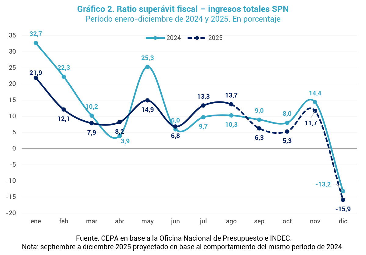 En agosto, el superávit primario representó el 13,7% de los ingresos totales del SPN. Esto significa que el Estado logró ahorrar $13,7 por cada $100 recaudados. Este ratio es superior al alcanzado en agosto de 2024 (10,3%), estabilizando la capacidad de ahorro en relación a los ingresos, y siendo un dato clave para monitorear la consistencia del programa fiscal.
