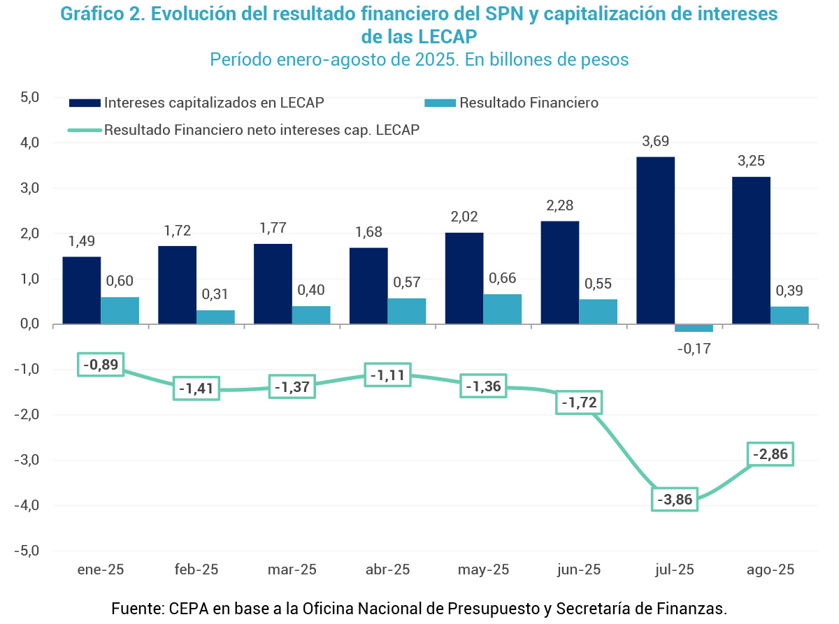 En consecuencia, aunque el resultado financiero de agosto de 2025 arrojó un saldo positivo de $0,39 billones, este cálculo no contempla la capitalización de intereses de los títulos públicos en pesos. Si se incluyen únicamente los intereses capitalizados en LECAP (el mismo mes alcanzaron $3,25 billones), el resultado financiero pasaría a ser deficitario por $2,86 billones. A su vez, observando el acumulado de los primeros ocho meses del año, el resultado financiero totaliza un superávit de $3,32 billones, mientras que los intereses capitalizados en LECAP suman $17,90 billones, cifra que supera en $5,93 billones la transferencia de utilidades efectuada por el BCRA al Tesoro el 25 de abril. Por lo tanto, considerando estos intereses capitalizados, el déficit financiero acumulado alcanzaría $14,59 billones.