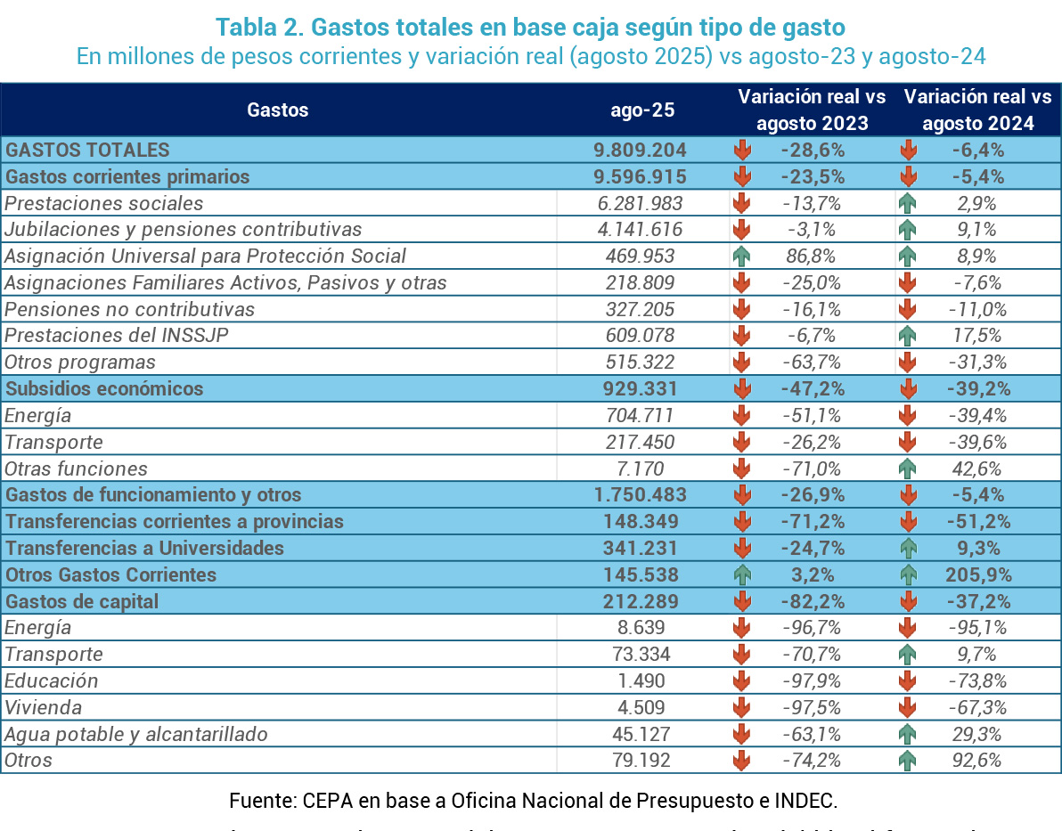 Los gastos totales del SPN fueron de $9,8 billones en el mes de agosto, lo que representa una caída real de 6,4% interanual. Esto evidencia la consolidación del ajuste realizado en 2024, ya que al comparar el gasto total contra agosto 2023, se observa una baja significativa que alcanza 28,6%.