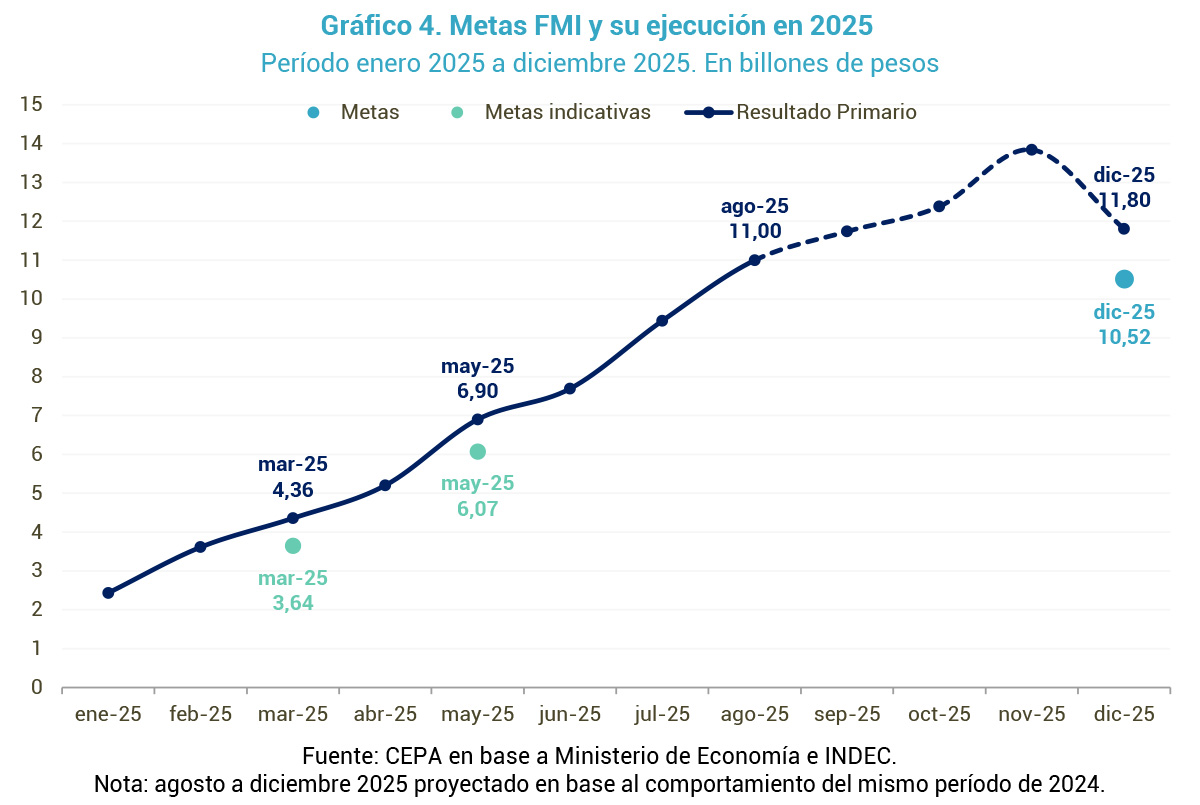 Originalmente, en el Staff Report del FMI se detallaron metas indicativas (estimaciones del organismo) y metas estrictas en materia fiscal. El monitoreo se realizará sobre el resultado fiscal acumulado de 2025, siendo la meta que debe cumplirse para habilitar un desembolso es necesario acumular $9,30 billones de superávit fiscal en septiembre. Sin embargo, en la revisión del 1 de agosto se eliminó la meta de septiembre, mientras que la de diciembre pasó de ser indicativa a estricta, requiriendo acumular $10,52 billones para dicho mes.
