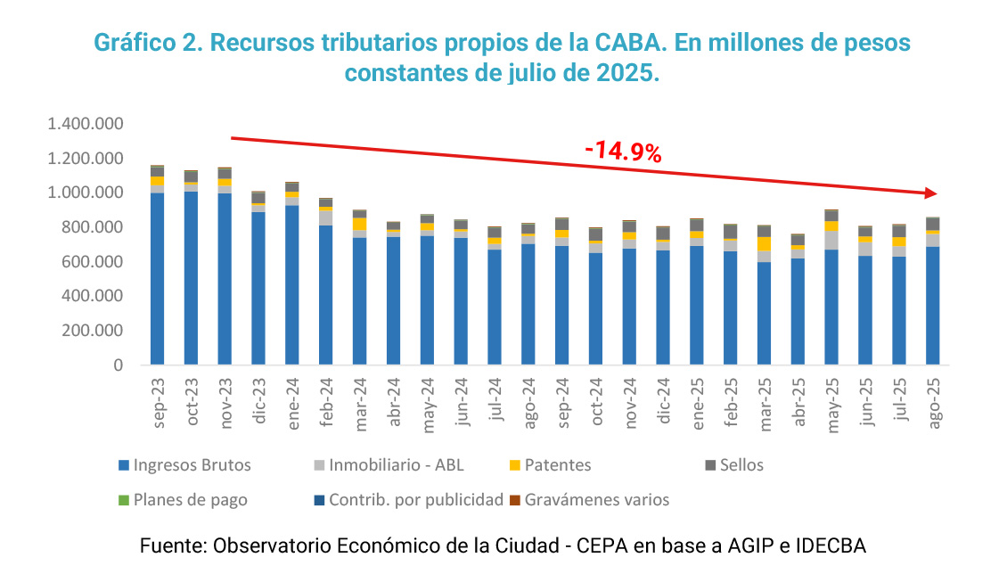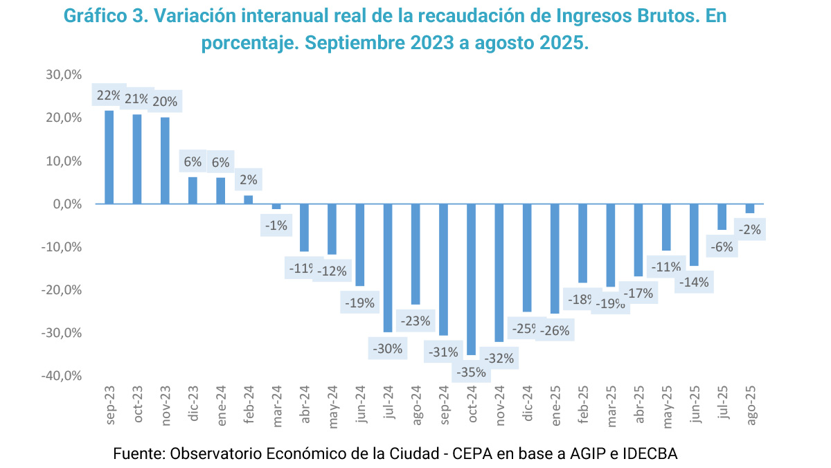 Analizando la dinámica de la recaudación propia de los últimos 24 meses, especialmente del Impuestos sobre los Ingresos Brutos, que como ya se advirtió es por lejos el principal ingreso de la Ciudad, se percibe un incremento real sostenido desde marzo 2023 hasta octubre de ese mismo año. A partir de octubre de 2023, Ingresos Brutos entra en un notable sendero de caída real de la recaudación. Entre octubre de 2023 y agosto 2025 dicha caída es del 32,2% en términos reales.