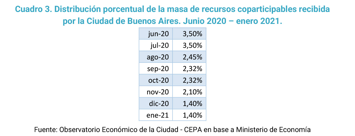 - Vinculado a este tema, el informe aborda el debate entre Ciudad y Nación respecto al coeficiente de Coparticipación y el acuerdo alcanzado: 1,4% de coparticipación por goteo diario, es decir la forma habitual; y el 1,55% adicional por transferencia semanal.