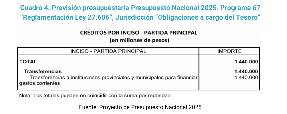 Los giros de dichos fondos no se realizarán junto al resto de los fondos coparticipables, sino que serán transferencias del Tesoro Nacional en el marco del Programa 67 “Reglamentación Ley 27.606” y “Cumplimiento de Medida Cautelar CSJN 1864/2022”, que revista en la Jurisdicción “Obligaciones a Cargo del Tesoro”.