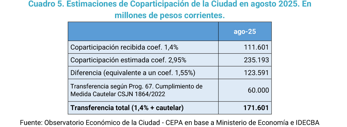 El CEPA realizó una estimación para conocer los montos de dinero en disputa. Durante el mes de agosto de 2025 la Ciudad recibió más de 111 mil millones de pesos de coparticipación y financiamiento educativo, equivalente al 1,4% de la masa de fondos coparticipables. El monto equivalente al coeficiente de 1,55% de coparticipación, es decir el adicional que resulta de la medida cautelar de la Corte Suprema, debería ser de 123 mil millones de pesos. En esta ocasión, la Nación transfirió a la Ciudad en concepto de la cautelar de la Corte el monto de 60 mil millones de pesos, o sea casi 63 mil millones de pesos menos de lo estimado. De esta forma, el monto efectivamente recibido durante este periodo fue de 171 mil millones de pesos, cuando según el coeficiente de 2,95% debiera haber sido de 235 mil millones de pesos.