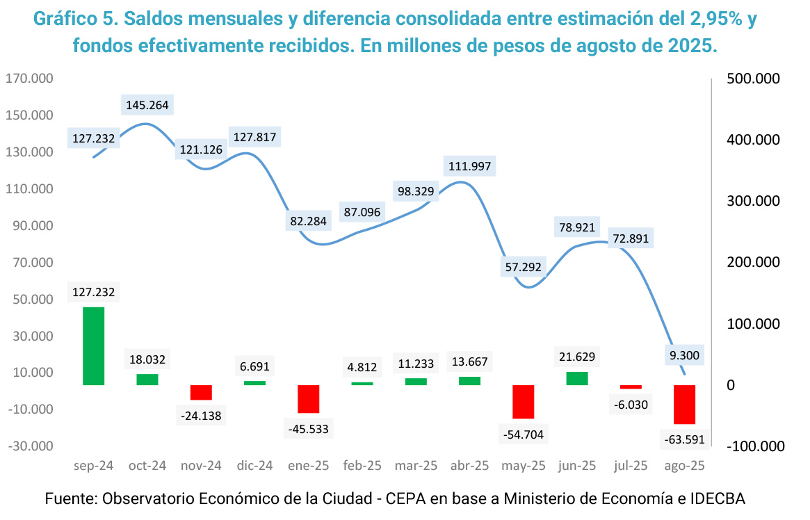 Sin embargo, al actualizar esos saldos a precios de agosto de 2025, se observa una tendencia marcadamente descendente, es decir que se está cerrando el diferencial entre lo que recibe la Ciudad y lo que le corresponde según la cautelar de la Corte Suprema. Al último mes analizado la diferencia consolidada entre la masa de recursos equivalente a un coeficiente de 2,95% y los fondos efectivamente recibidos por la Ciudad es de tan solo 9.300 millones de pesos.