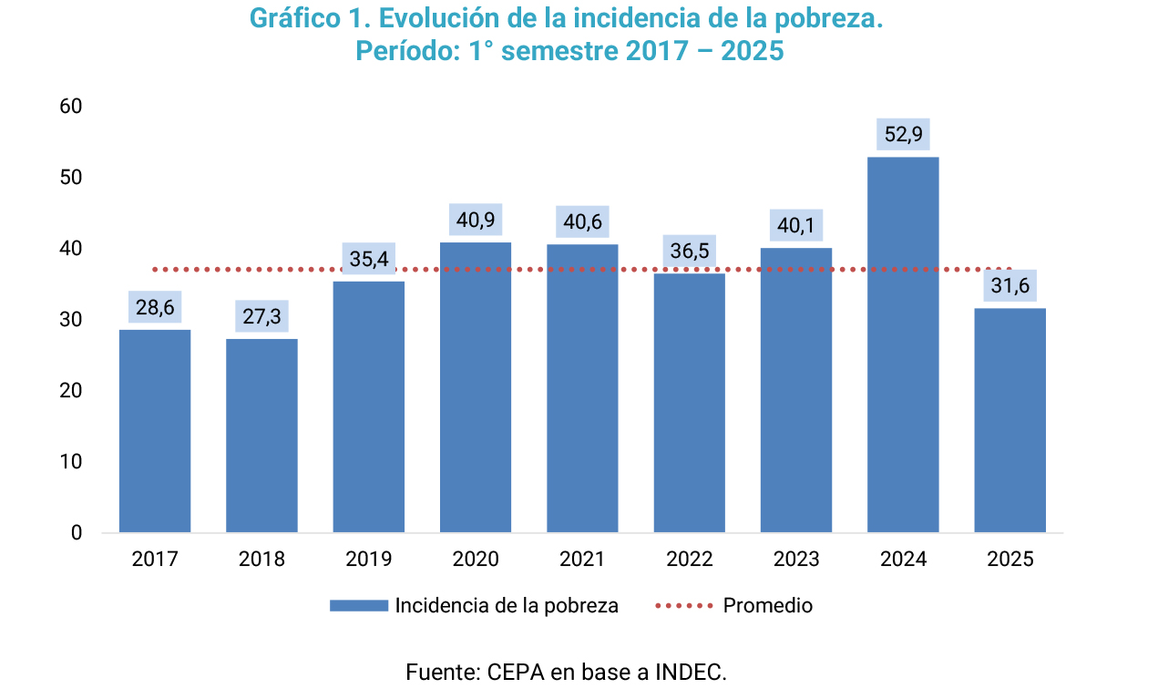 La tasa de incidencia de pobreza cuantifica la cantidad de personas que vive en hogares que no tienen ingresos suficientes para cubrir el costo de una Canasta Básica Total, la cual se componen de alimentos y otros bienes y servicios básicos. Durante el primer semestre de 2025, la población que vivió en la pobreza llegó a 31,6%, una disminución de 21,3 p.p. respecto al primer semestre de 2024 y de 6,5 p.p. respecto al segundo semestre de 2024, donde había alcanzado 52,9% y 38,1% respectivamente (la comparación con el segundo semestre de 2024 es sólo a modo de referencia porque metodológicamente sólo corresponde la comparación con semestres equivalentes). En el caso de la indigencia, el dato actual implicó una disminución de 11,2 p.p respecto al primer semestre de 2024 (18,1%) y de 1,3 p.p. respecto al segundo semestre de 2024 (8,2%).