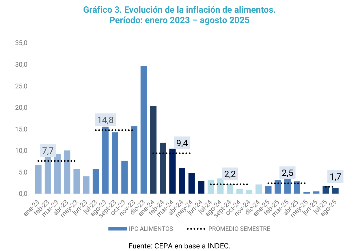 - Inflación de alimentos: el nivel de inflación de alimentos en el primer semestre 2025 (2,5%) se ubicó considerablemente por debajo del primer semestre de 2024, período posterior al salto del tipo de cambio de 118,0%: (9,4%) -6,9 p.p. Como se observa a continuación, los meses de mayo y junio traccionan a la baja los niveles de inflación de alimentos, al encontrarse por debajo del promedio semestral. Respecto al semestre anterior, se experimentó una aceleración en el margen: de 2,2% a 2,5%. Como el precio de los alimentos determina los niveles de la canasta alimentaria y, en buena medida, de la canasta total, una disminución tan significativa de la inflación de alimentos implica una considerable disminución de la tasa de incidencia de indigencia y de pobreza.