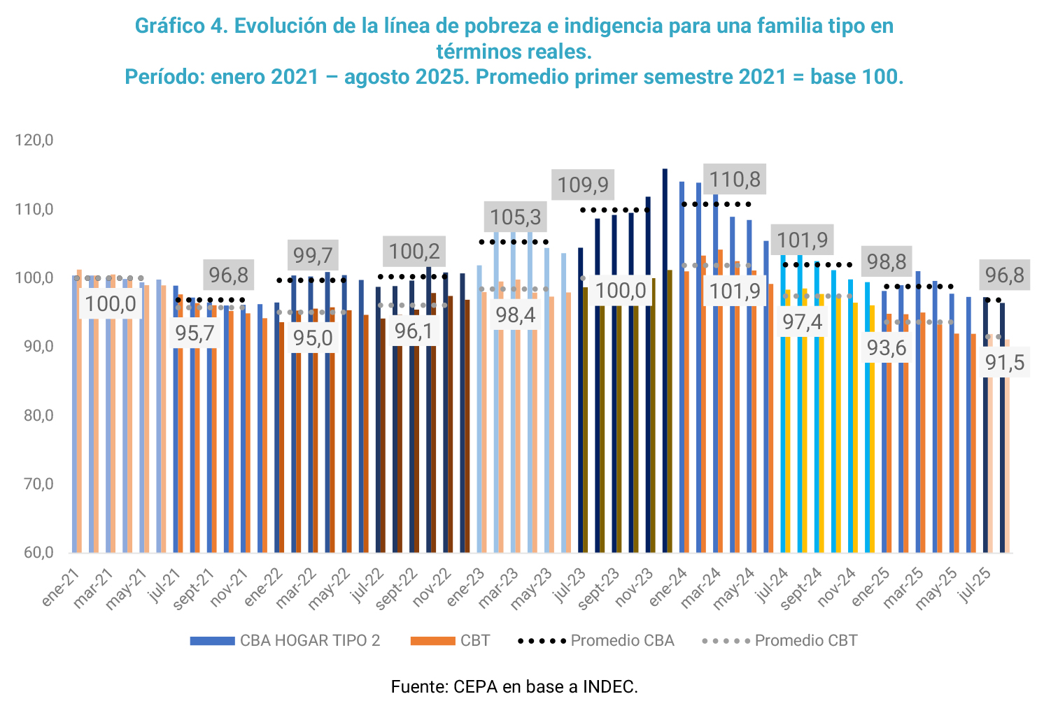 El efecto es muy concreto: al multiplicar la CBA por un valor más bajo, la CBT queda en un nivel sensiblemente inferior y permite que los ingresos (aun sin demasiado dinamismo) queden por encima de la línea de pobreza.