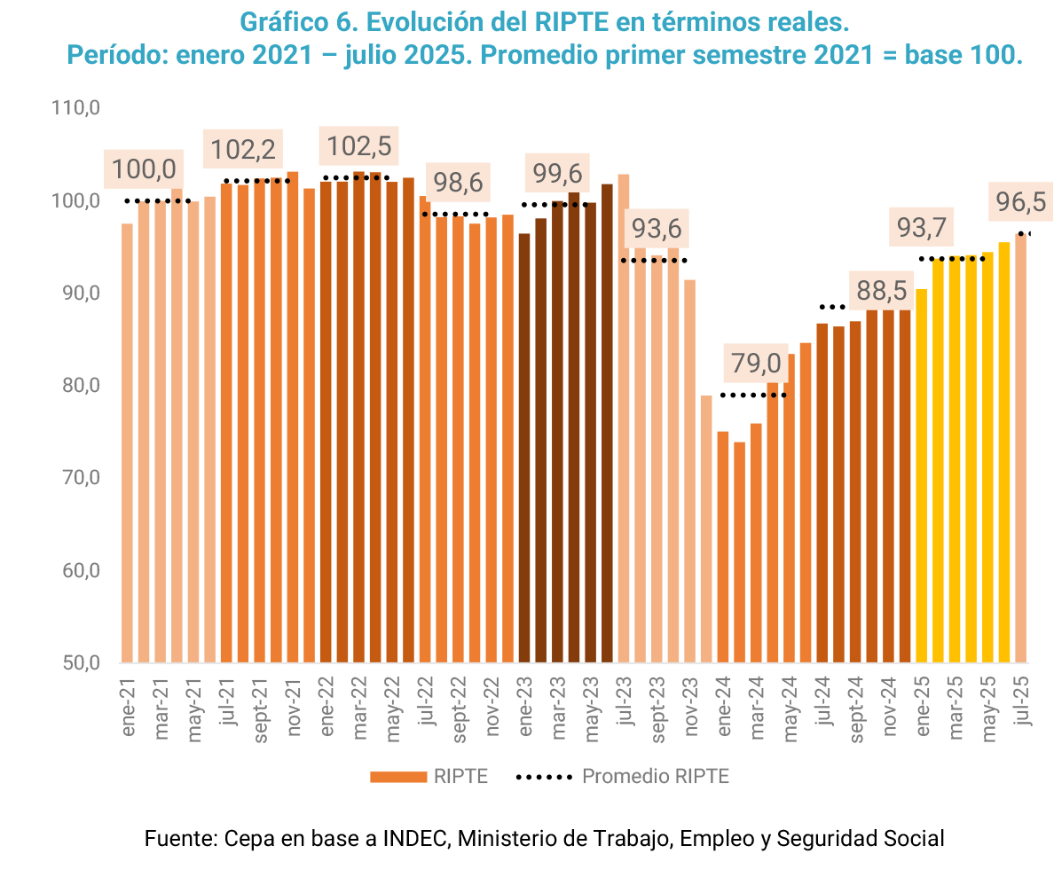 - RIPTE: muestra, en el primer semestre de 2025, una mejora en términos reales de 14,7 p.p. respecto al primer semestre del año 2024 y una mejora de 5,2 p.p. respecto al segundo semestre de 2024.