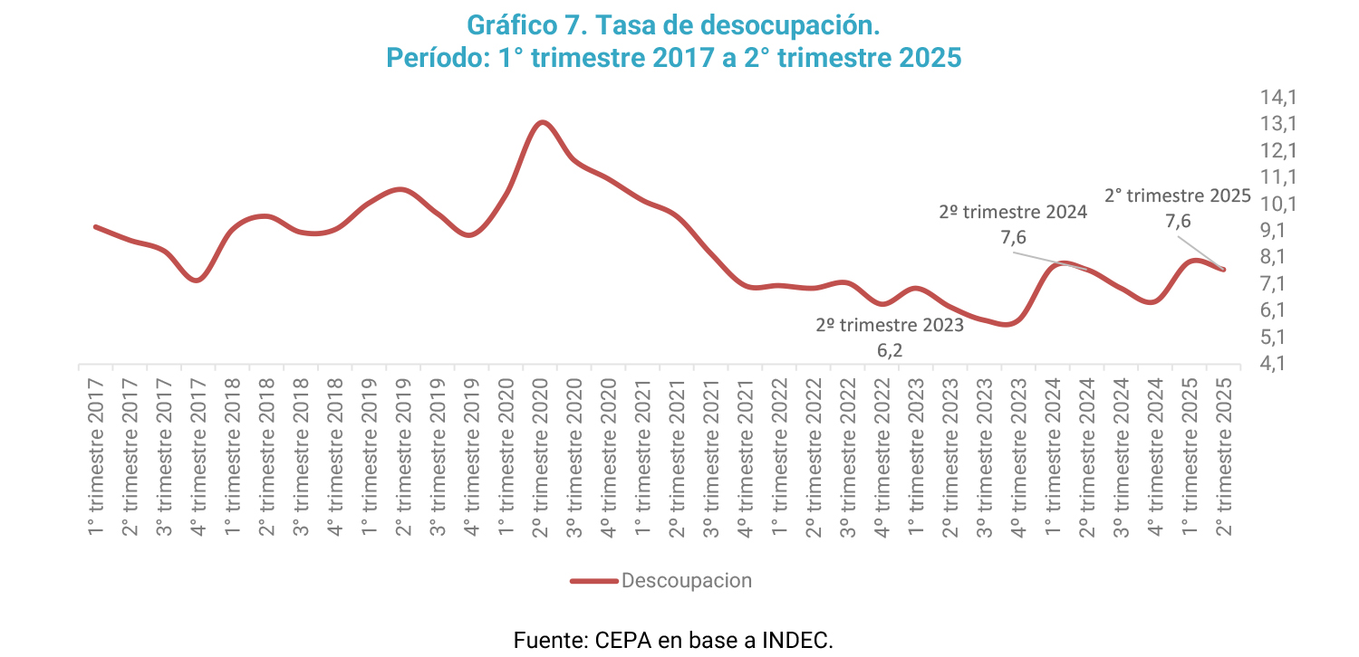 - Indicadores de empleo: durante el primer semestre de 2025 se mantuvieron en el mismo nivel los indicadores de empleo con respecto a igual semestre del año anterior. La desocupación se ubicó en, 7,7% para el promedio de los primeros dos trimestres de 2025, mismo guarismo que el primer semestre 2024.