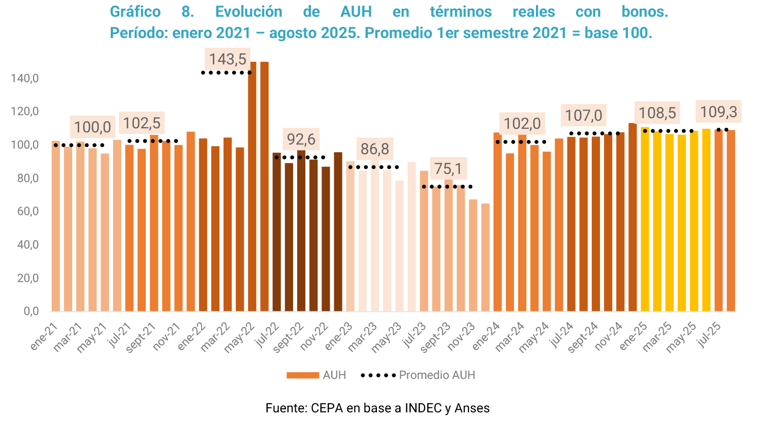 - AUH: en el primer semestre de 2025, el valor real de la AUH aumentó 6,4 p.p. respecto del nivel del primer semestre de 2024. A su vez, incrementó su valor en 1,5 p.p. con respecto al semestre anterior.