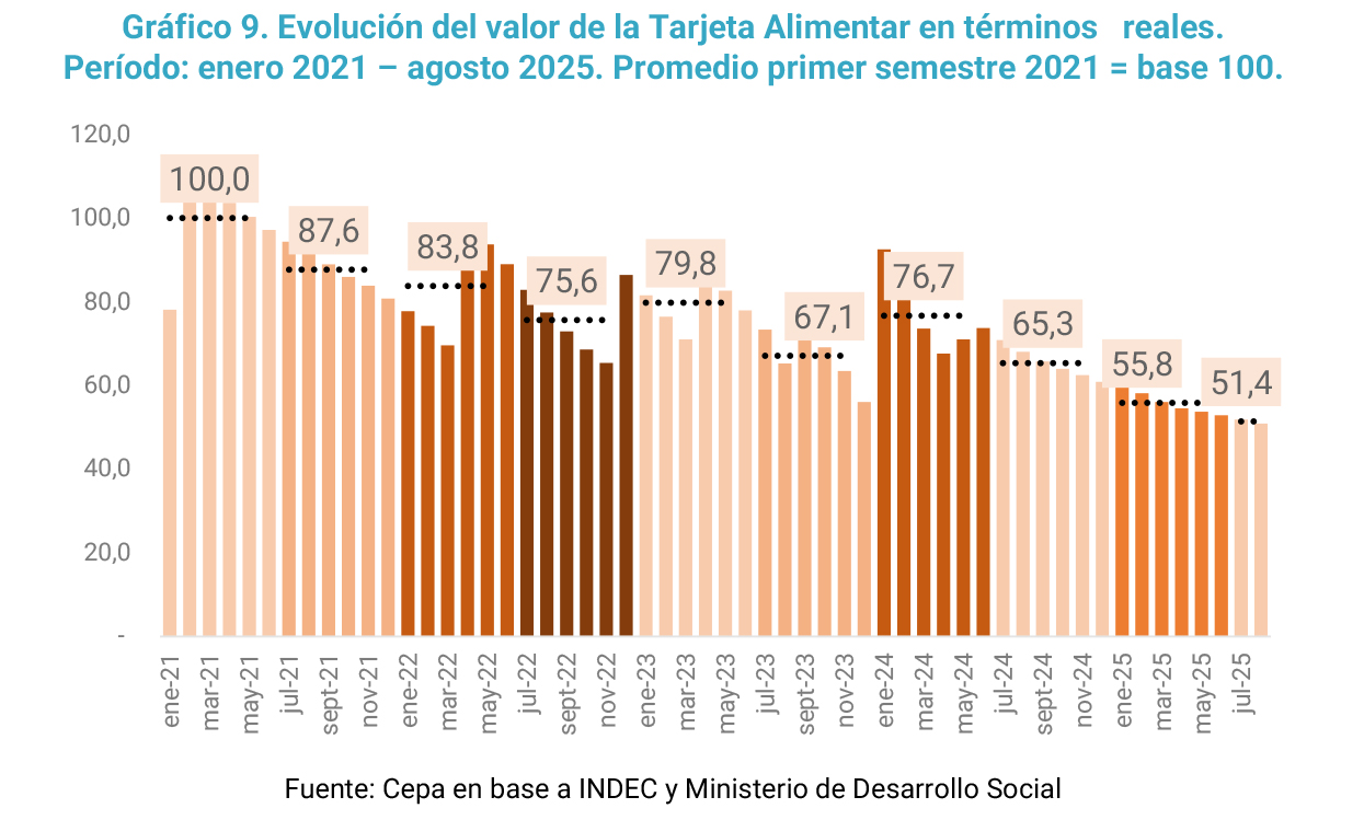 Complementariamente, se percibe una desmejora en la evolución real de los ingresos de la Tarjeta Alimentar, congelada en $52.250 desde junio 2024: en el primer semestre de 2025 se reduce 20,9 p.p. respecto al primer semestre de 2024. La comparación da cuenta, además, de una disminución de 9,5 p.p. respecto del semestre inmediato anterior.