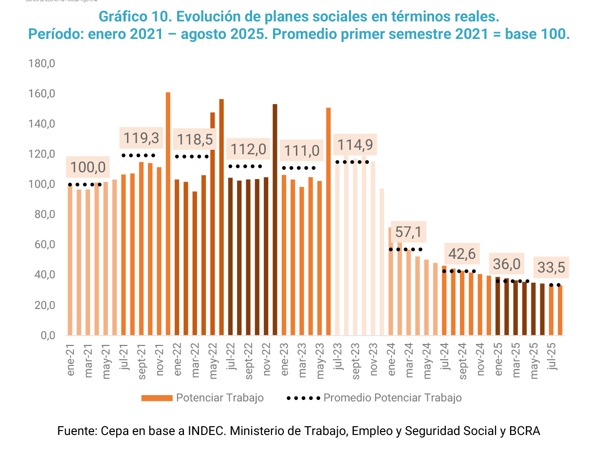 - Planes sociales: el escenario muestra una fenomenal reducción de su poder adquisitivo de 21,1 p.p. respecto al primer semestre de 2024 y -75,0 p.p. respecto al primer semestre de 2023 (como resultado del congelamiento del programa en $78.000 desde enero de 2024). Con respecto al semestre anterior, la disminución alcanza 6,6 p.p.
