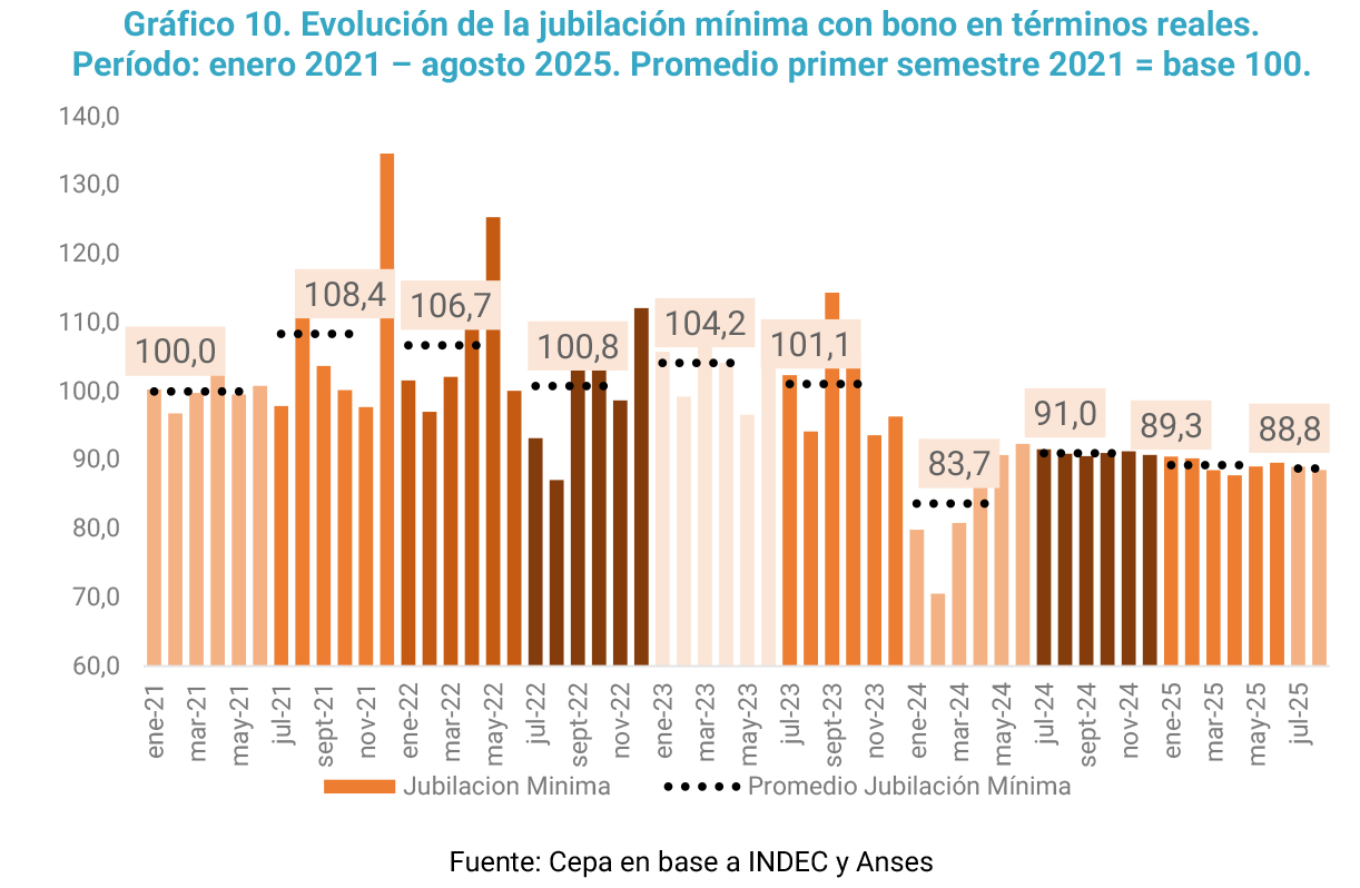 - Jubilación mínima con bono: en el primer semestre de 2025, la jubilación mínima con bono registró una mejora de 5,6 p.p. respecto al mismo período de 2024, aunque todavía se mantiene 14,9 p.p. por debajo del nivel alcanzado en el primer semestre de 2023. La mejora obedece a que, en el primer semestre de 2024, tras el cambio de fórmula, las jubilaciones sufrieron la mayor pérdida de poder adquisitivo. En comparación con el semestre inmediato anterior, se verificó una caída de 1,7 p.p.