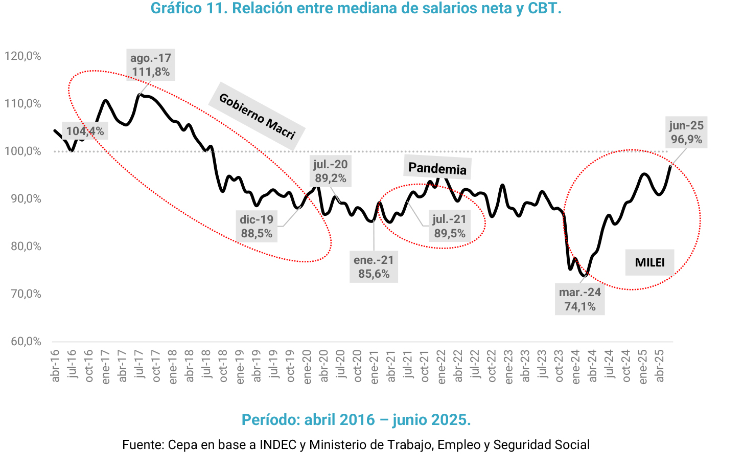 - Al comparar la mediana de salarios con la CBT se observa que no logra recuperarse lo perdido durante la gestión de Cambiemos. Los datos muestran que la mediana salarial neta pasó, entre finales de 2017 y finales de 2019, de superar a la CBT en 12 p.p. a quedar por debajo de la misma en 11,3 p.p. (una retracción de 23,3 puntos). Durante la actual gestión de Milei la relación llegó al mínimo de la serie (74,1%) para alcanzar, en junio 2025 a cubrir el 96,9% de la CBT.