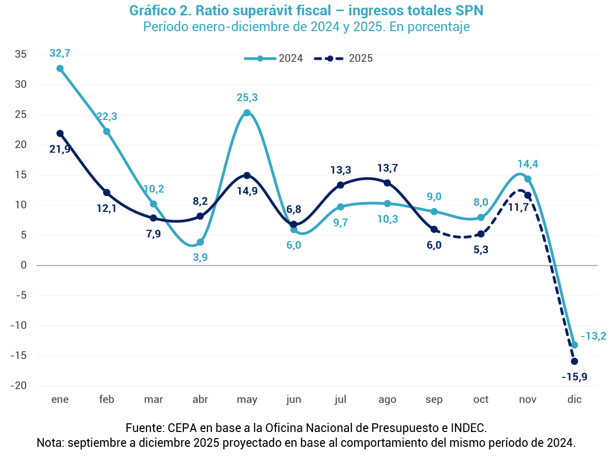En septiembre, el superávit primario representó el 6,0% de los ingresos totales del SPN. Esto significa que el Estado logró ahorrar $6,0 por cada $100 recaudados. Este ratio es inferior al alcanzado en agosto de 2024 (8,9%), una medida clave para monitorear la sostenibilidad del programa fiscal.